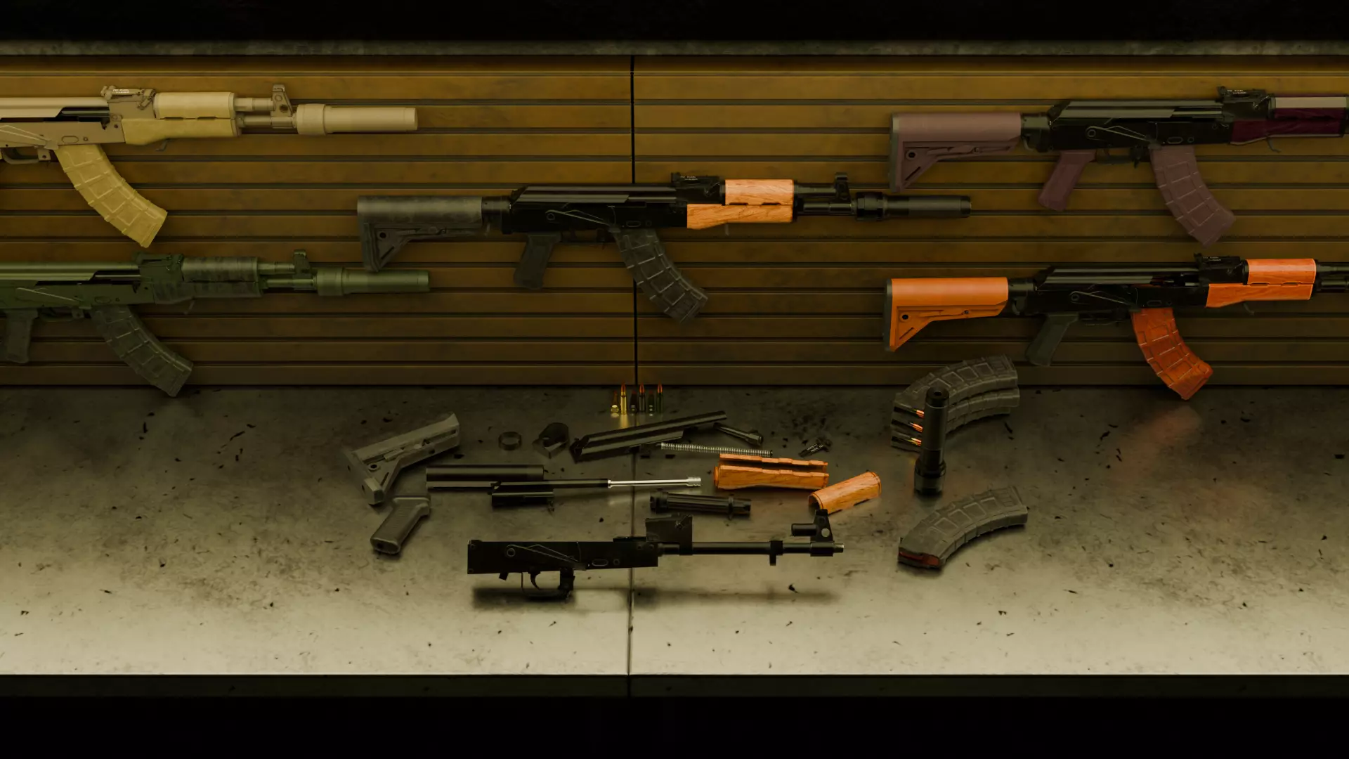 Fully customizable AK with internals. Game asset with baked on detail. It is modeled to size. It is the low poly version of the model, however the poly count will reflect that it includes all of the internals. This would be good for a game like Tarkov where you want the AK to be able to be heavily modded with other parts. The grip,stock adapter, dust cover, rear sight, handguards, gas tube, and muzzle device can all be removed and replaced as you would. The alternate paint jobs are included. Plum, Iodine ( + fakelite mag and stock), Flat Dark Earth, OD green. Brass case, steel case, and lacquer cases for the ammo.