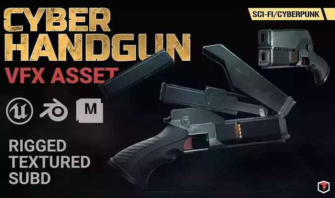 Introducing the Cyber Handgun from Eli's Quest Asset Pack - a powerful and visually striking 3D asset for your sci-fi or futuristic project. It features a distinctive and unique reloading mechanism. Whether you're an experienced artist or just starting, the Futuristic Cyber Handgun is easy to implement and a valuable learning resource for those interested in 3d modeling, texturing and rigging.