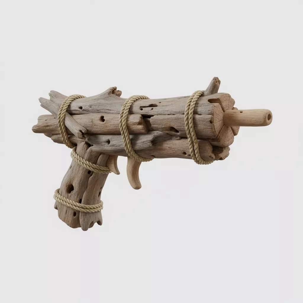 The Driftwood Drencher is a masterfully crafted squirt gun design that merges creativity and nature into a single rustic concept. Built entirely from hollow driftwood logs, this imaginative piece features a body formed by intertwining wooden branches, held together by coarse rope bindings for a raw, handmade aesthetic. Its organic design gives it the appearance of something both ancient and inventive — as if forged by an island survivor or crafted for a fantasy adventure world.