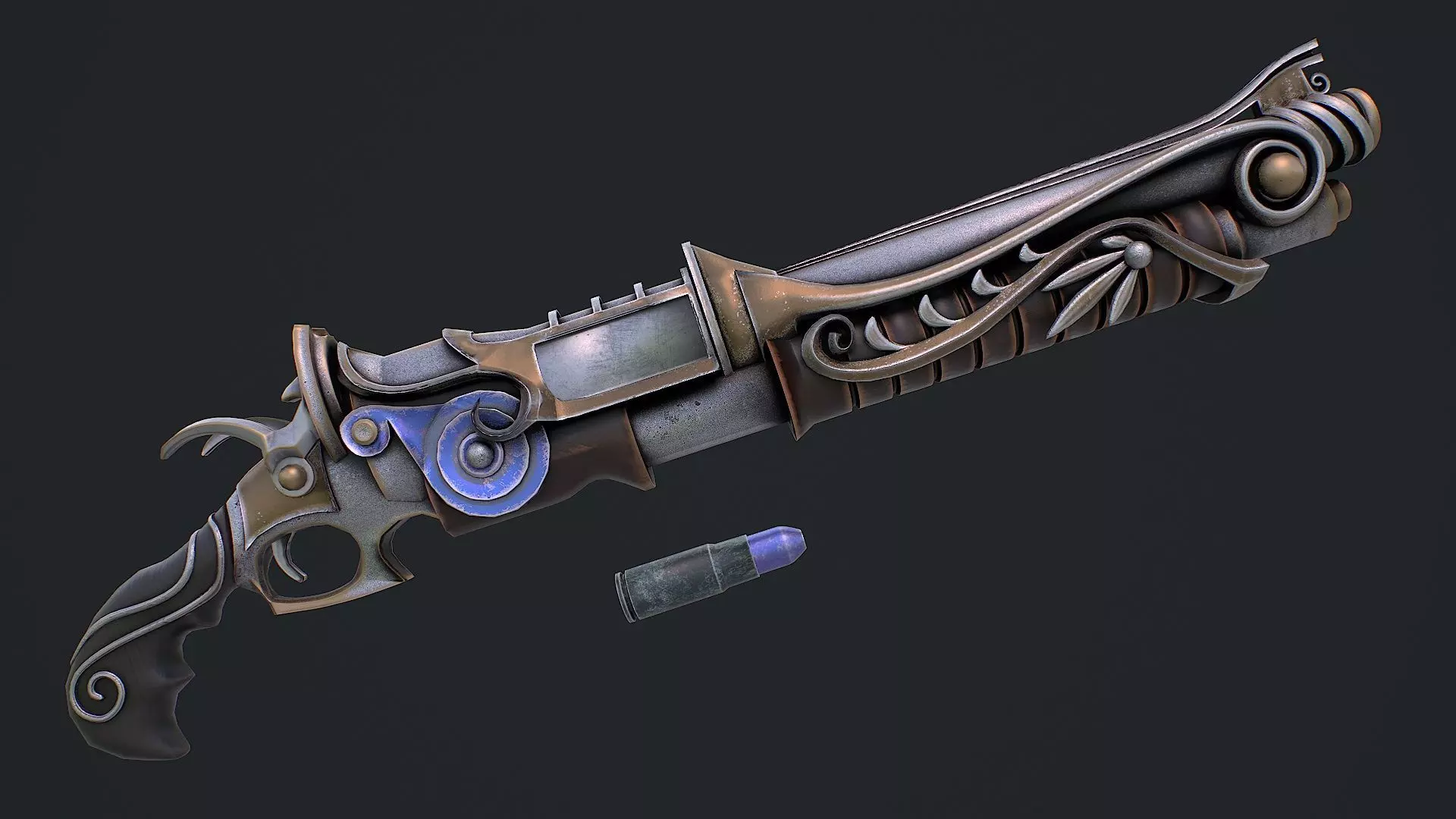Hello. This is a high definition quality polygon of a Fantasy rifle 1 3 3D Model with PBR textures. Extremely detailed and realistic. Suitable for movie prop, architectural visualizations, advertising renders and other. The archive includes Obj and FBX, textures for the Unity: Base color, Height, Metallic, Mixed AO, Normal_OpenGL, Roughness. And also included in the archive textures for UE: BaseColor, Normal, OcclusionRoughnessMetallic. All textures are 4k resolution. The model contains 7 objects: bullet, cartridge_case, Fantasy_rifle_1, hammer, hammer_1, lock, trigger.