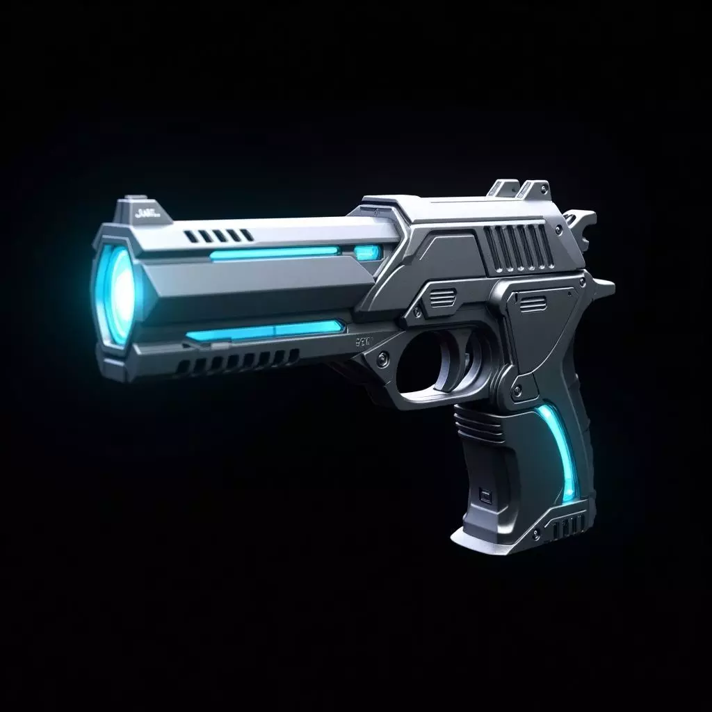 Sleek Futuristic Pistol: Compact metallic body with glowing blue energy channels.