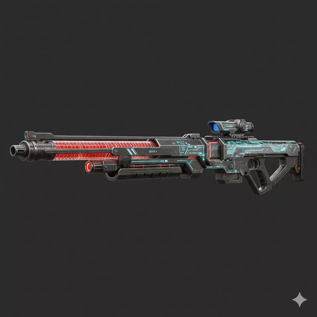 LaserRifleFuturisticSciFiWeaponGunPBRGamePropMetallicEnergyGlowRedBlueCyberpunkSniperTacticalLongBarrelAdvancedTech
