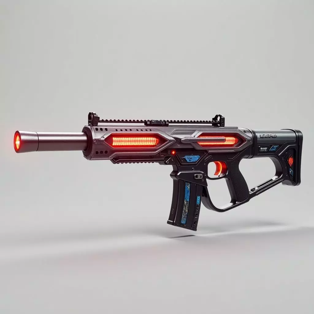 Aggressive Futuristic Rifle: Sleek metallic body with glowing red energy coils.
