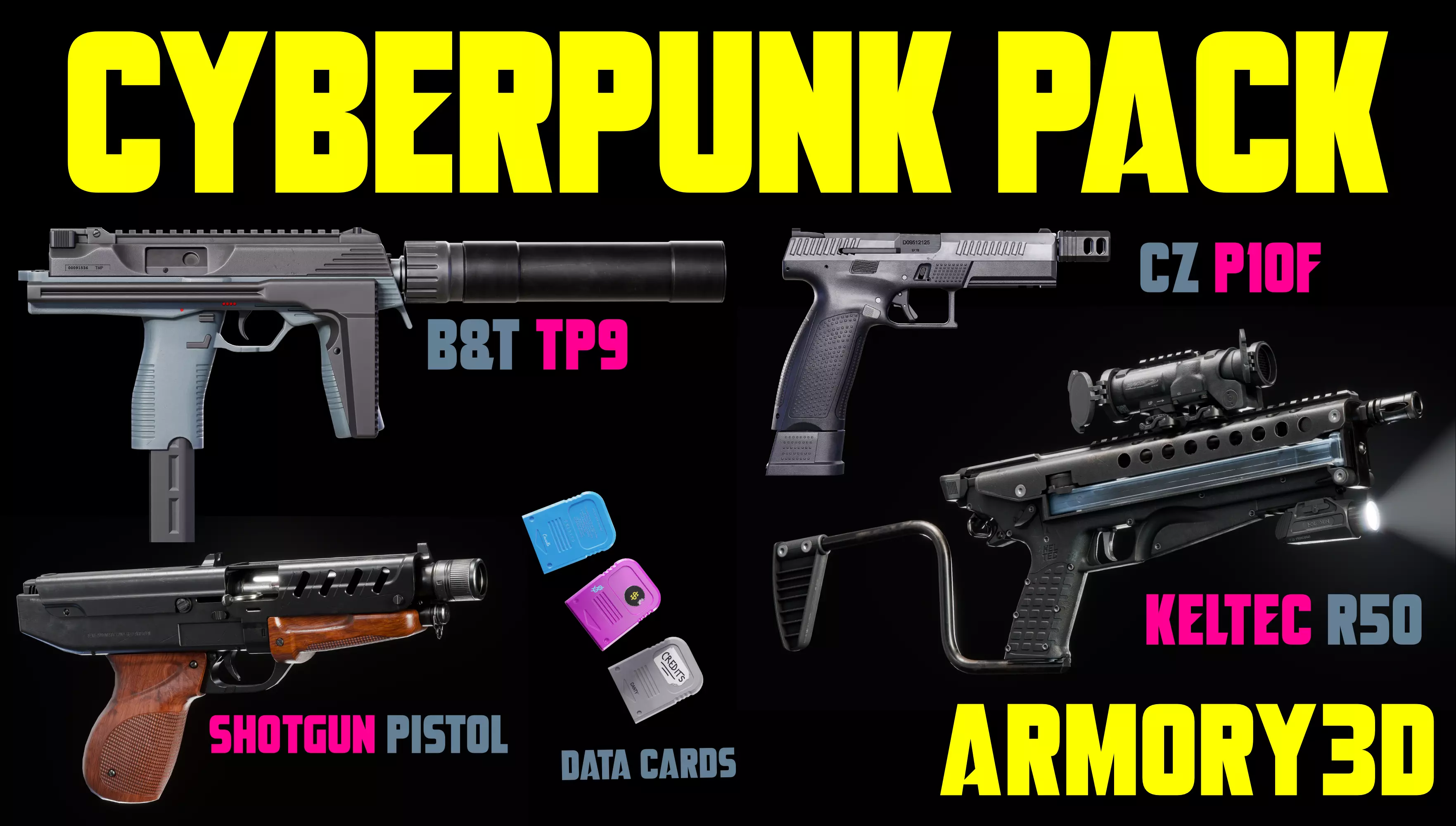 Game-Ready Models: Each weapon is fully rigged and optimized for immediate use in your game engine of choice.Low Poly Design: Ensures performance without sacrificing quality, perfect for VR and AR applications.Hyper-Realistic PBR Textures: Designed to enhance visual fidelity with realistic lighting and shading, bringing a true-to-life feel to your assets.Customizable Skins: The memory cards come in three unique skins, allowing you to customize your game’s aesthetic effortlessly.Rigged FBX Files: All models come with rigged FBX files, including compatible Unity and Unreal Engine files, making integration into your projects a breeze.Elevate your game’s arsenal with these essential cyberpunk weapons, designed to deliver both visual impact and seamless functionality. Whether you’re creating a dystopian world or a high-tech battlefield, this pack is your gateway to an unforgettable gaming experience. Don’t miss out – gear up and dive into the future with our Cyberpunk Weapons Pack!