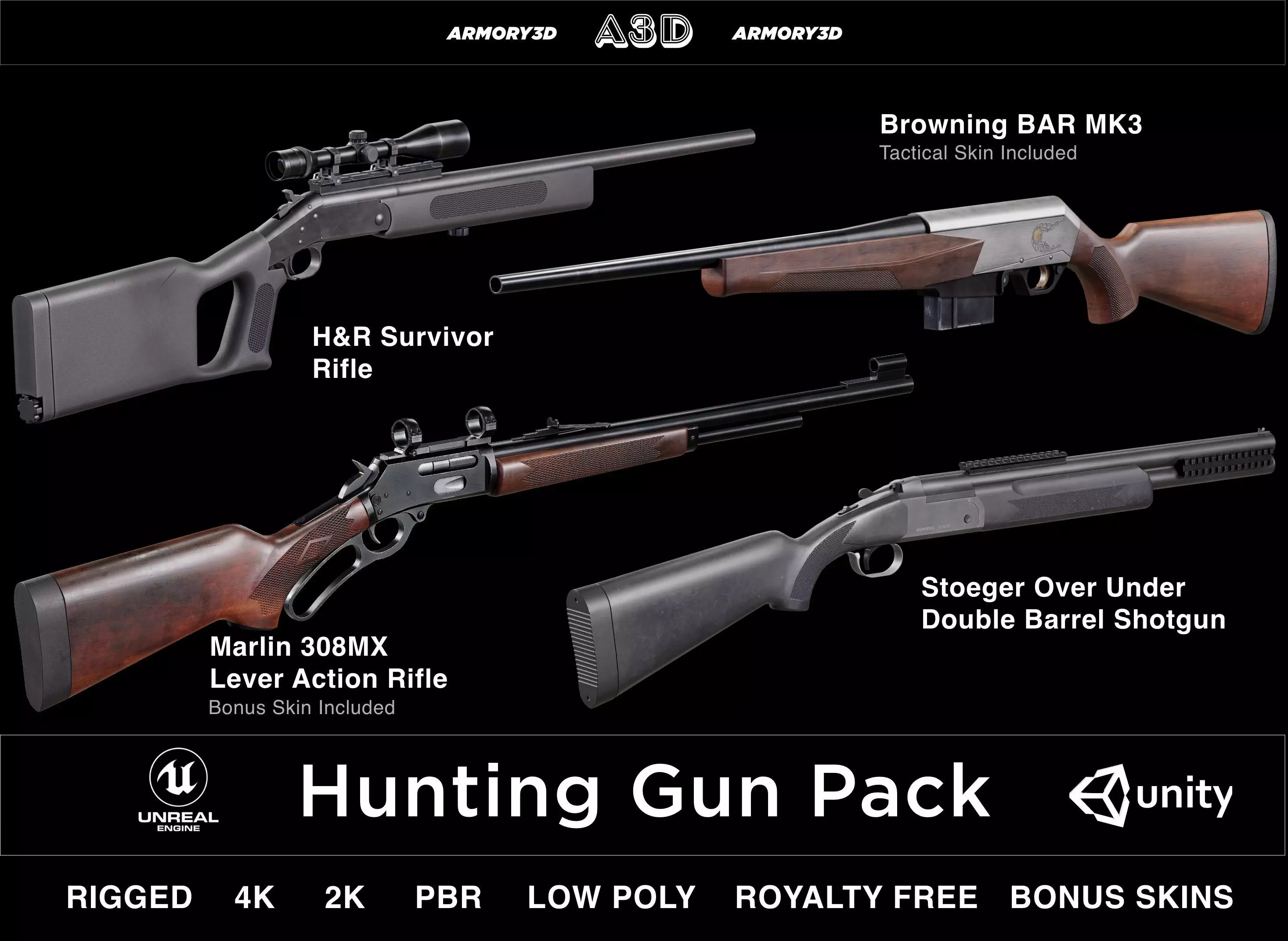 Introducing the Hunting Gun Pack, a curated collection of four realistic firearms tailored for hunting enthusiasts and outdoor survival scenarios. Each model is meticulously crafted and optimized for authenticity, providing essential assets for game developers, filmmakers, and 3D artists looking to capture the essence of hunting and outdoor adventures.