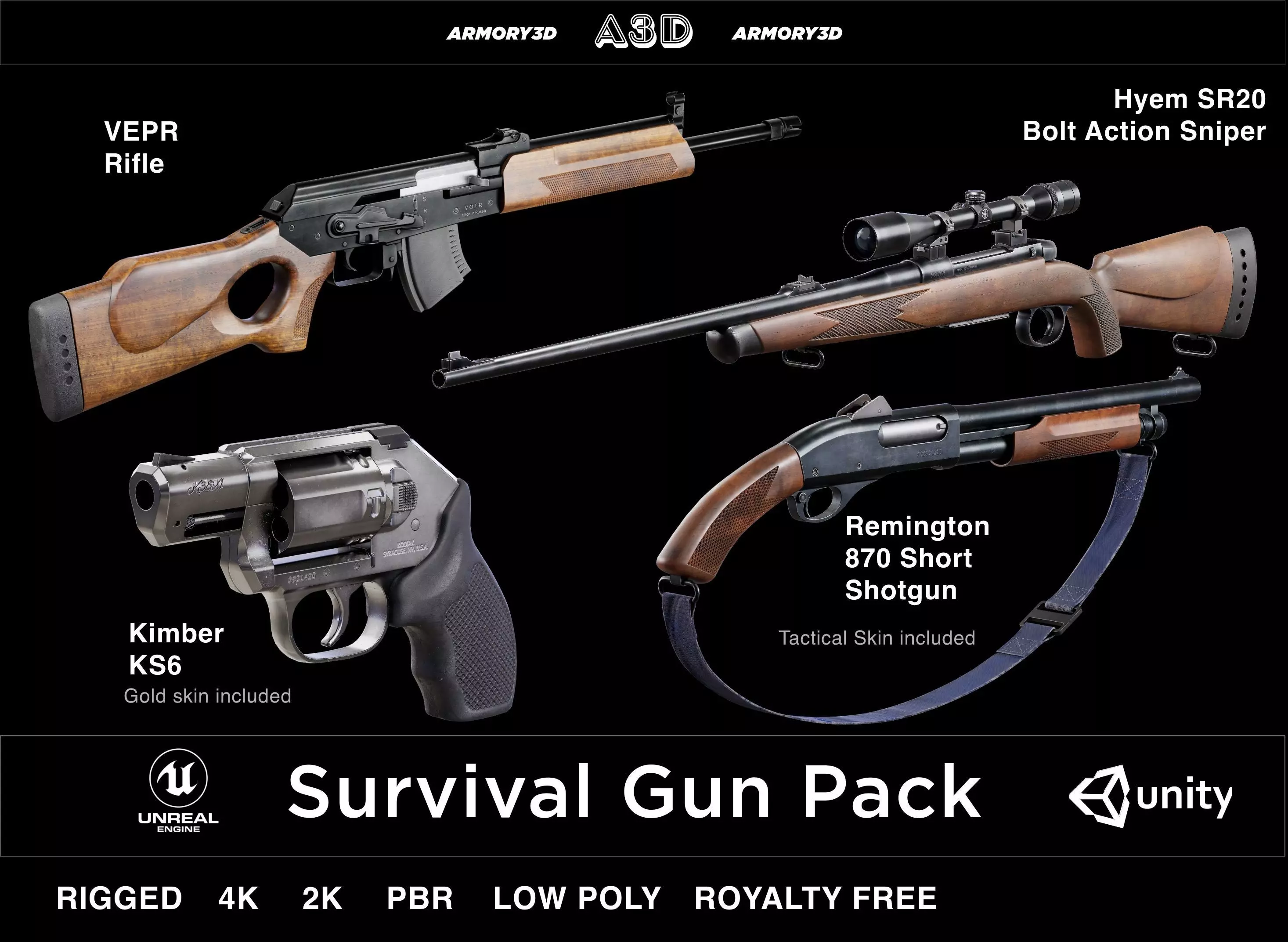 Introducing the Survival Gun Pack, a collection of four realistic firearms inspired by iconic models used in survival and tactical scenarios, reminiscent of The Last of Us video game series. Crafted with meticulous attention to detail, these models are essential assets for game developers, filmmakers, and 3D artists seeking authentic weaponry with both aesthetic appeal and functional realism.