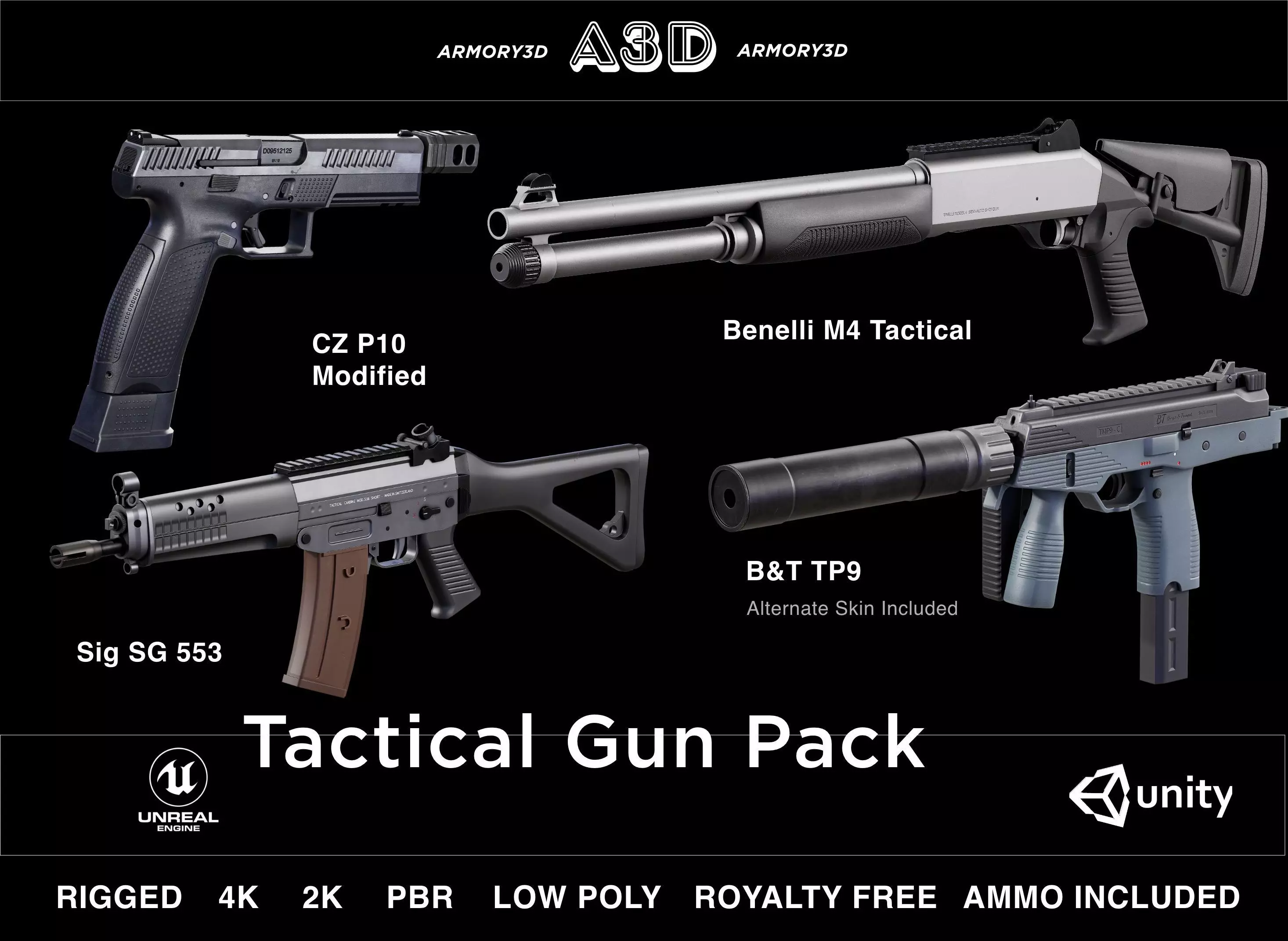 The Tactical Gun Pack includes four meticulously crafted weapons, each designed to maintain realistic visuals while ensuring low poly efficiency. The pack features:
