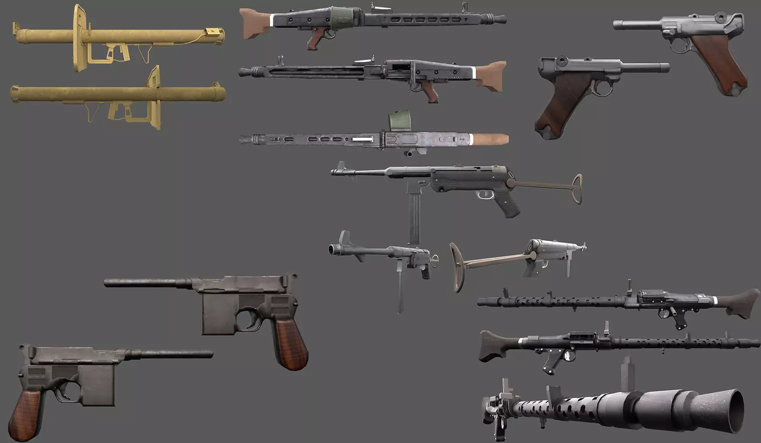 A collection of weapons from World War 2 used by the Germans. They are all game ready with low poly and unwrapped UVs. Textures are all 2k.