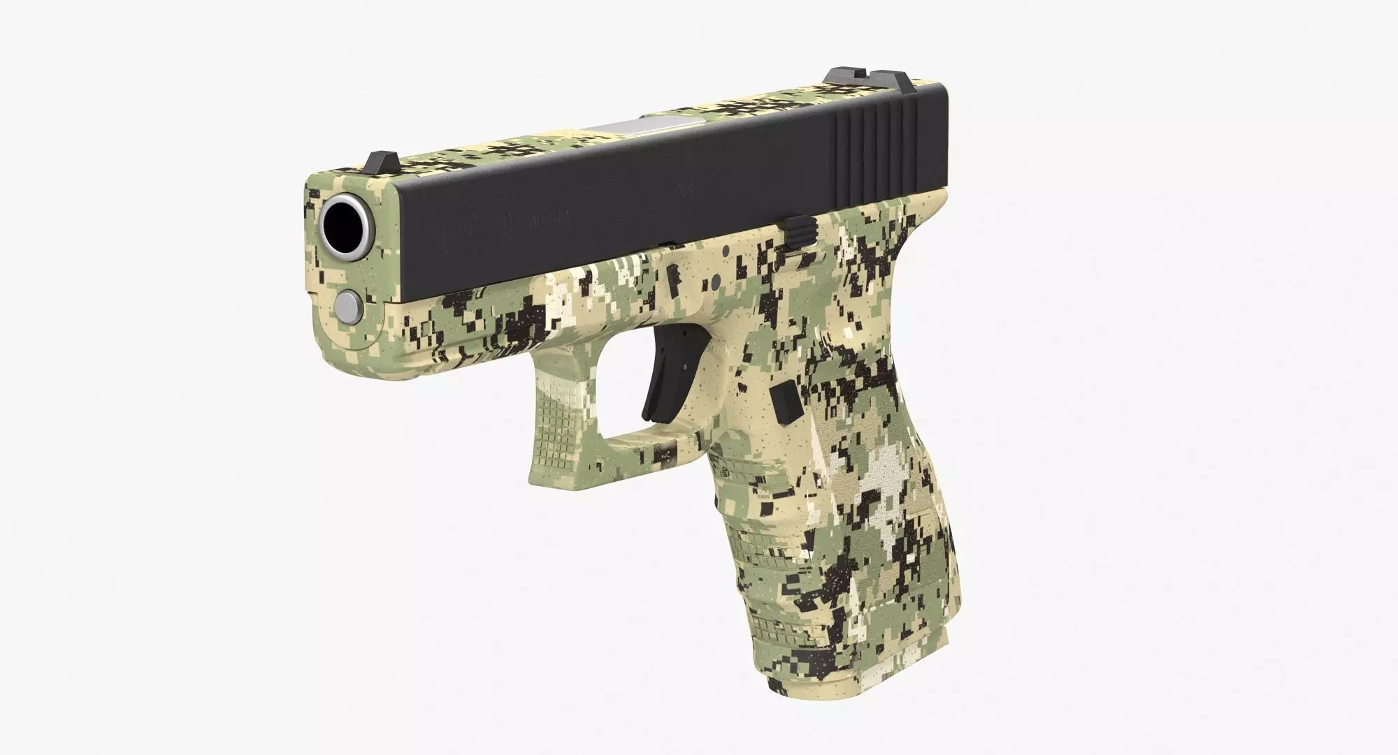 This Glock 19 Camouflage Green is a high quality, photo real model that will enhance detail and realism to any of your rendering projects. File units - cm. The model has a fully textured, detailed design that allows for close-up renders, and was originally modeled in 3ds Max 2017 and rendered with V-Ray.