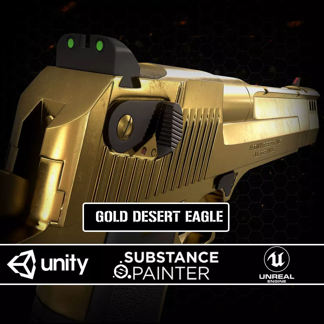 Gold Desert EagleSubstance Painter 2019 Textured (4k) - Renders : MarmosetLowpoly, optimized for any game engines. High quality textures to supports physically based rendering (PBR). Comes with textures optimized for Unreal Engine 4 and Unity 5 And Substance Painter Export.Substance Painter Export Textures: BaseColor, Metallic, Roughness, Normal, AOUnity 5 Textures: Albedo, MetallicSmoothness, NormalUnreal Engine 4 textures: BaseColor, OcclusionRoughnessMetallic, Normal