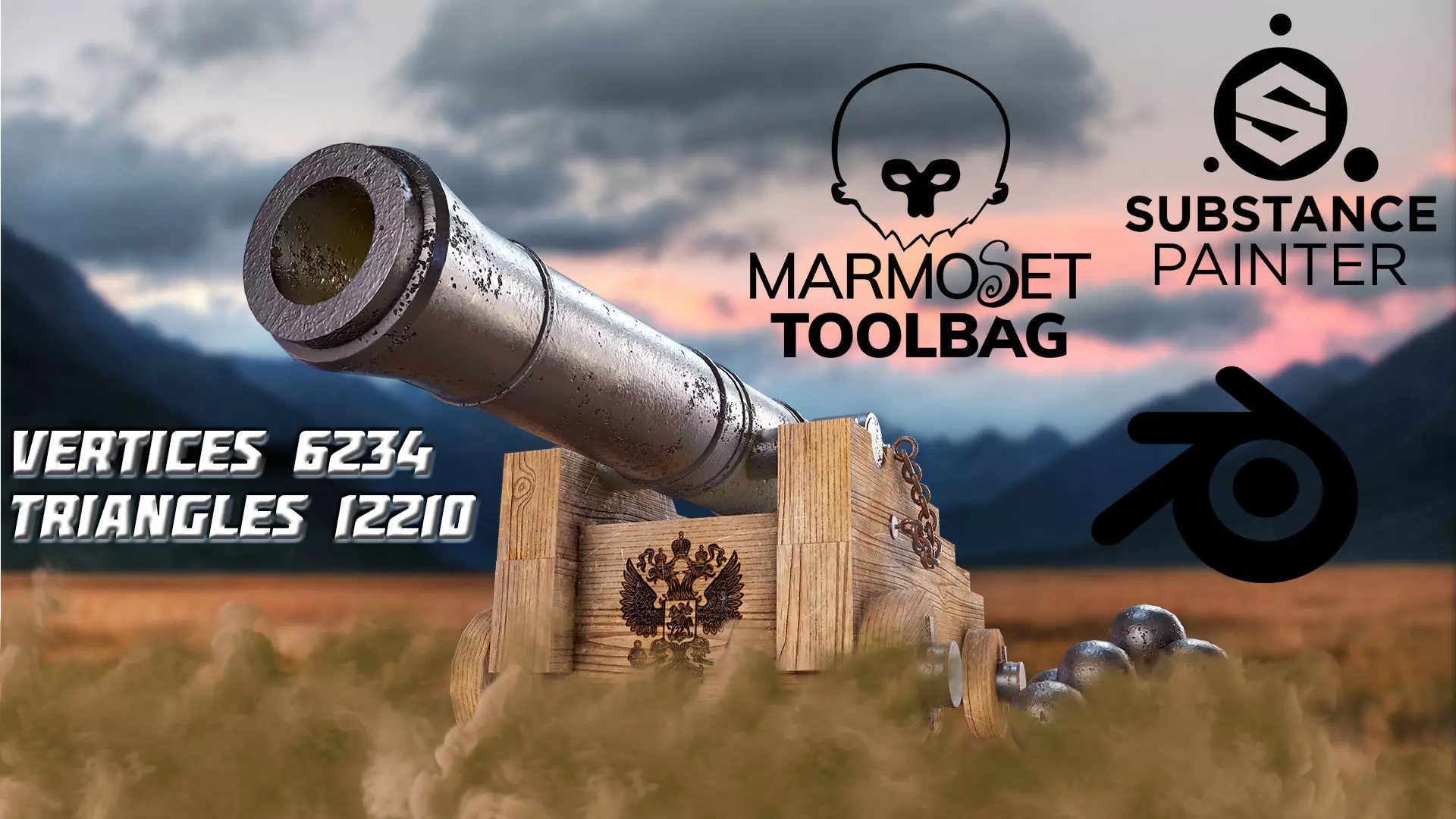 • Historical cannon with the coat of arms of Russia game ready asset is a high quality, low poly asset originally modeled in blender 2.92.0