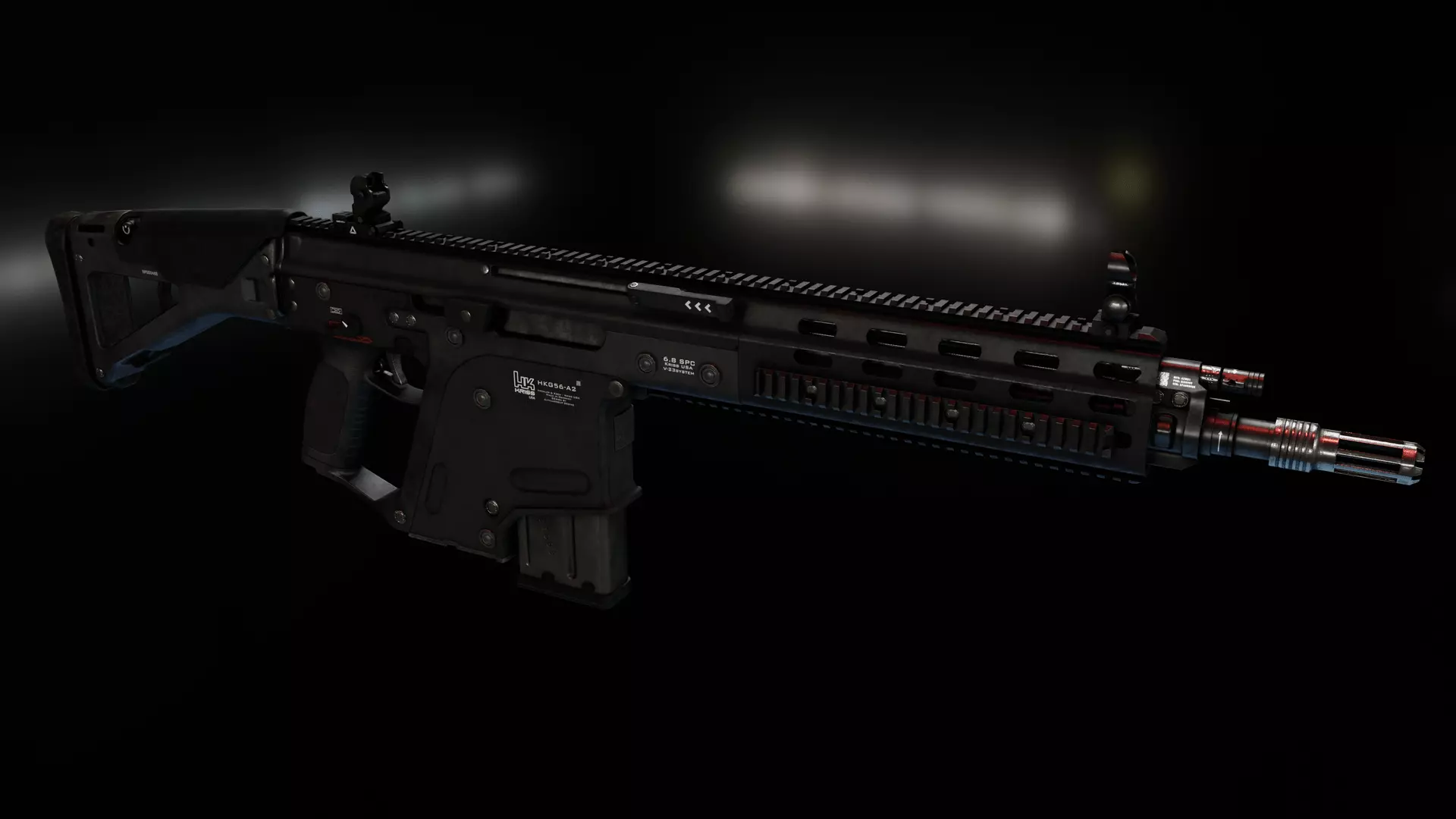 A mockup of a gun made by Alex Jessup about six years ago, a weird mix of HK design with Kriss Vector system. It's totally unrealistic as larger calibers would throw that bolt through the bottom with speed of... well speed of bolt smashing through metal and plastic. Beside that, original image lack few details on some parts, so I was wondering how we could make it more realistic, so I moved few bits here and there, and also came up with different approach to recoil operated mechanism that super V have and separate it to two parts with one part that take initial blow of gasses plus have non-reciprocate handle andecond part have rotating bolt with interlocking slugs that move down as in Kriss Vector. It's still far from realistic but closer as it separates all that power of larger caliber to two parts...