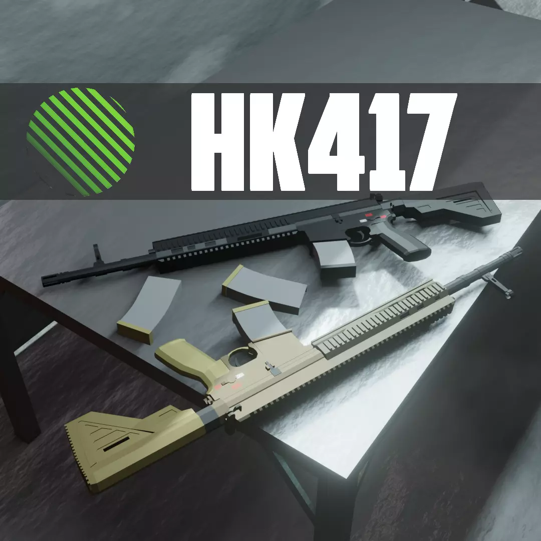 The Heckler & Koch HK417 is a battle rifle/designated marksman rifle designed and manufactured by Heckler & Koch in Germany. It is the larger caliber version of the HK416, and chambered for the 7.62×51mm NATO rifle cartridge. It is a gas-operated, selective fire rifle with a rotating bolt. The HK417 is intended for use in roles where the penetrative power, stopping power, and range of the 5.56×45mm NATO HK416 would otherwise be insufficient. The HK417 has been adopted for service by a number of armed forces, special forces, and police organizations.