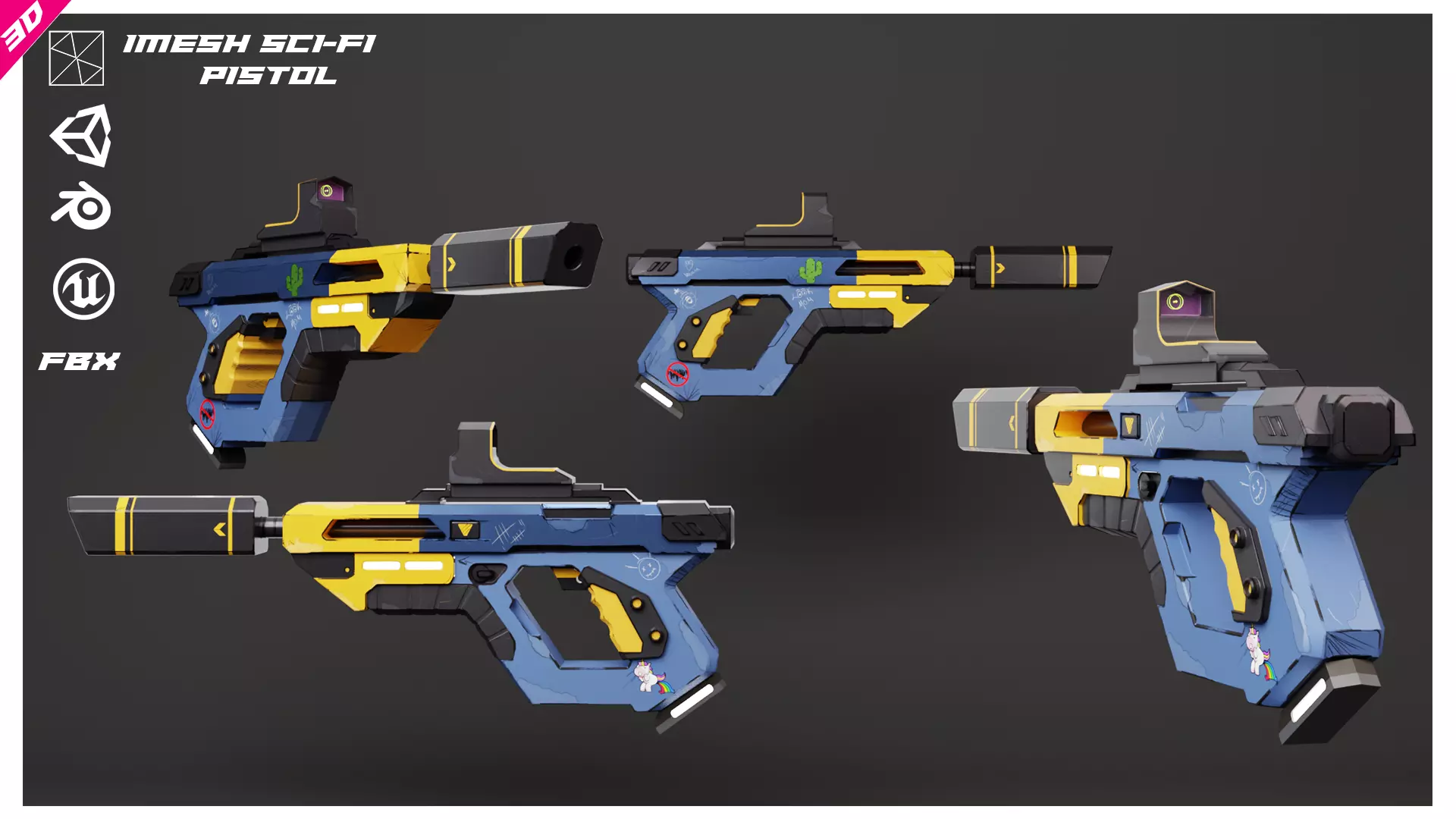 -Game-ready model for Unity, Unreal Engine, Blender, and other 3D applications.-Optimized meshes with animation-friendly pivot points.-Reflex sight system customization available in Unity (URP/HDRP) only.-Standard PBR textures for Unreal and Blender.-Substance Painter and Blender files for additional customization.This asset is ideal for developers looking for a versatile sci-fi weapon to enhance their game or 3D project!