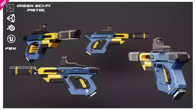 The IMESH Sci-Fi Pistol is a high-quality, game-ready 3D model designed for use in various engines and software, ideal for futuristic or cyberpunk projects. The asset is optimized for performance in real-time applications and features a customizable reflex sight system specifically designed for Unity (URP/HDRP), where users can easily modify sight type, color, and glass.