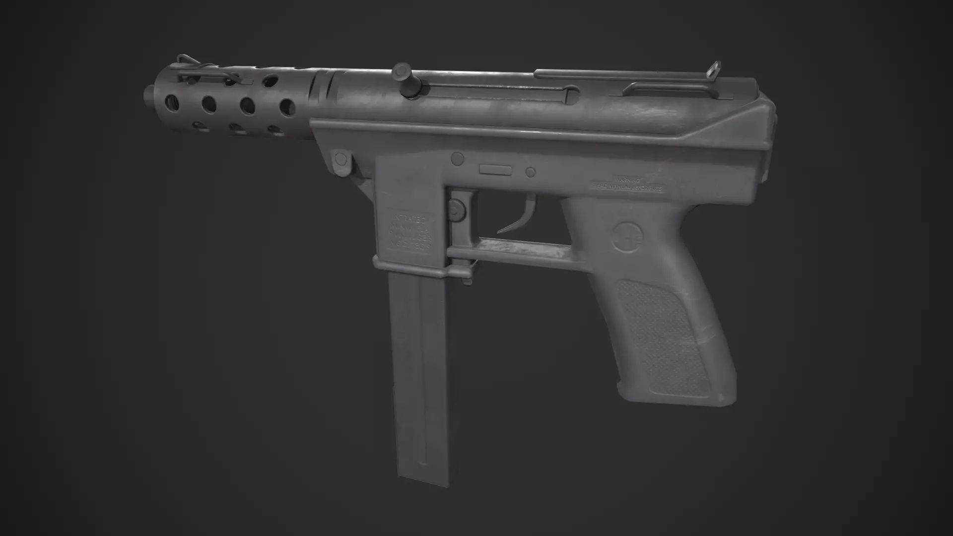 Game-ready Intratec TEC DC9 asset, with PBR textures included in the files. This has 4274 polys (7977 tris) and 4106 vertices. Note: changing the normal mesh settings in the native Maya file is not recommended.