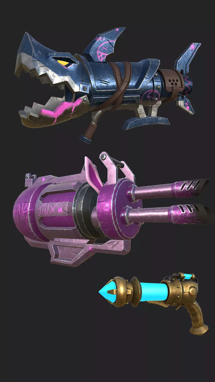Jinx weapons, in fbx format ready to texture, go to Facebook and ask for the code to download for free @Karrotmaster and you will also find a texture tutorial.