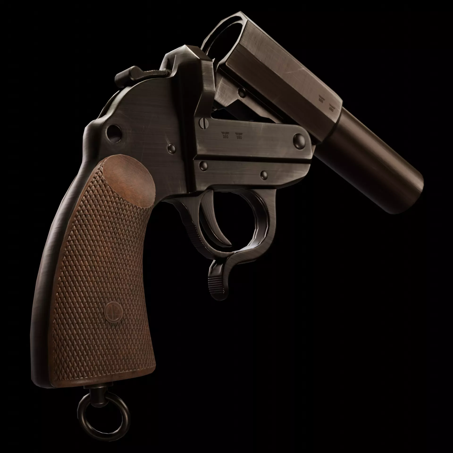 This is a game ready model of a german world war 2 flare gun Leuchtpistole 34 also know as Kampfpistole. Also, two different types of ammunition for this pistol are added to the file. PBR materials with textures in 2-4K for the gun and 1-2K for the Ammo are added to the models. A rig has also been added to simplify positioning or creating animations.