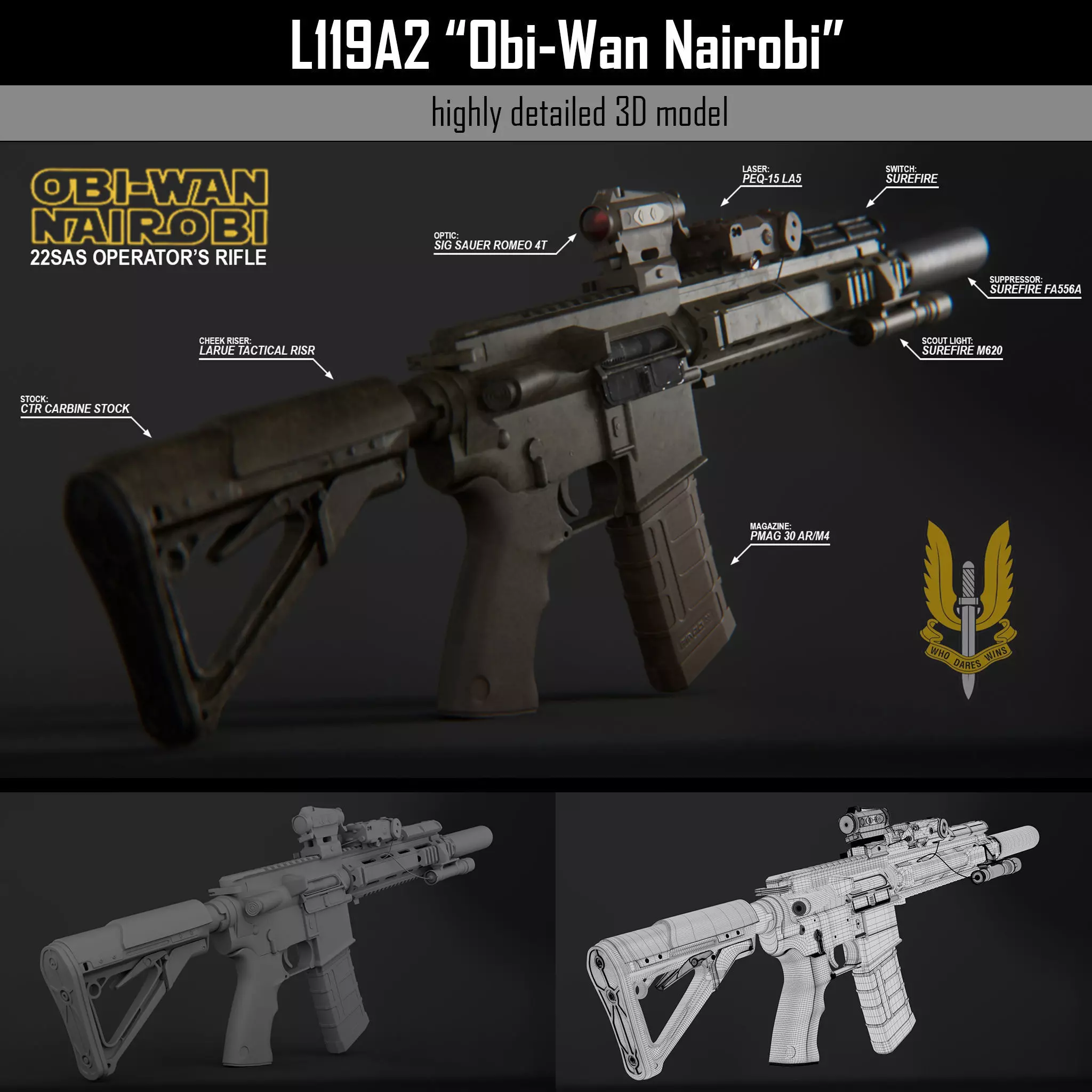 Detailed, highpoly model of L119A2 used by 22 SAS operator Christian Craighead, also known as Obi-Wan Nairobi. Modelled and assembled according to the available pictures and articles.SPECS: