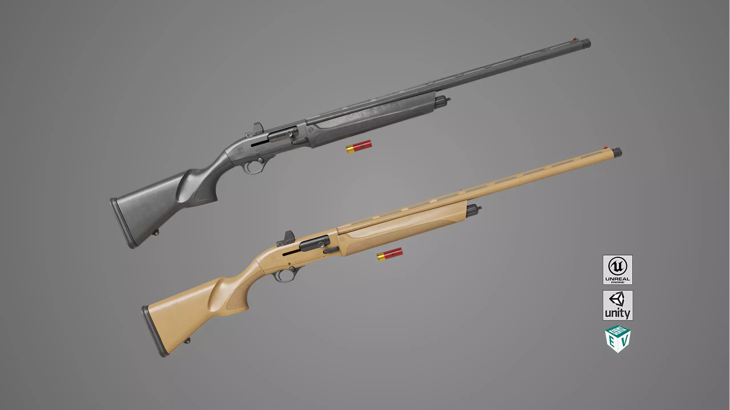 The Photorealistic 3D model of Long Shotgun 03 Black and Sandal With Single Mat, This model is suitable for any visual production - broadcast, high-res film close-ups, advertising, games, design visualization, forensic presentation, etc