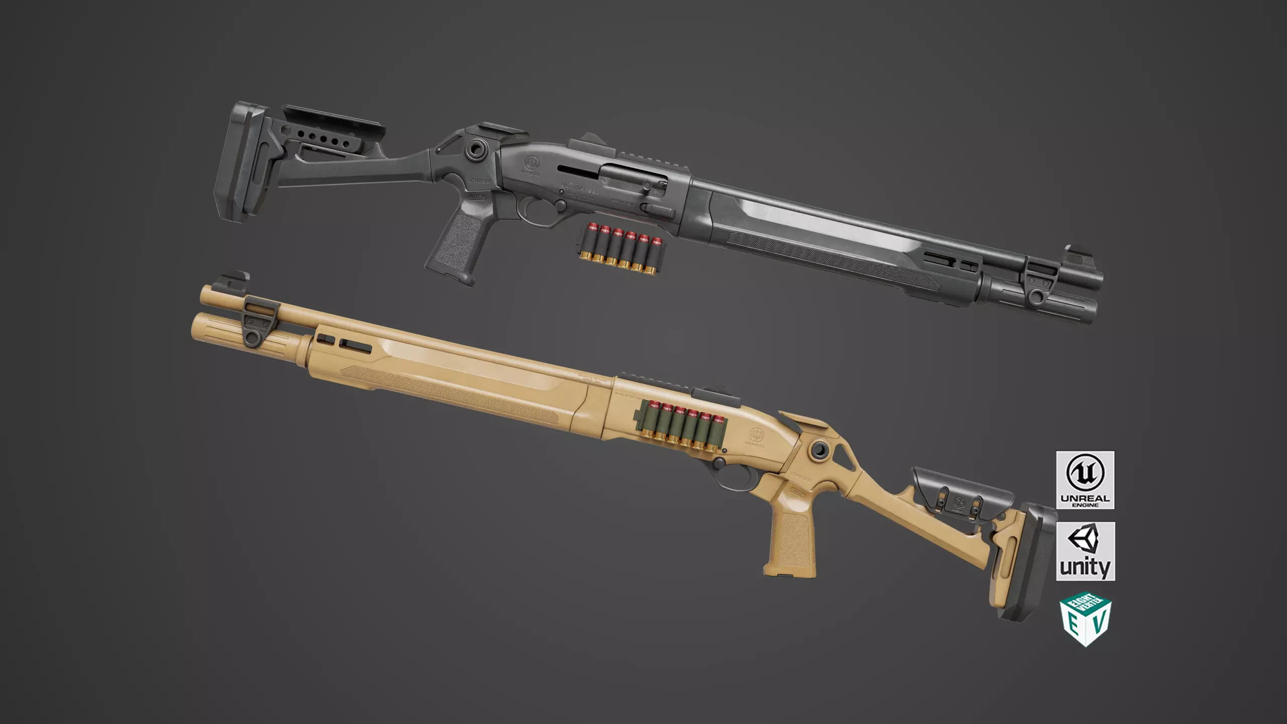 The Photorealistic 3D model of Long Shotgun 04 Black and Sandal With Single Mat, This model is suitable for any visual production - broadcast, high-res film close-ups, advertising, games, design visualization, forensic presentation, etc