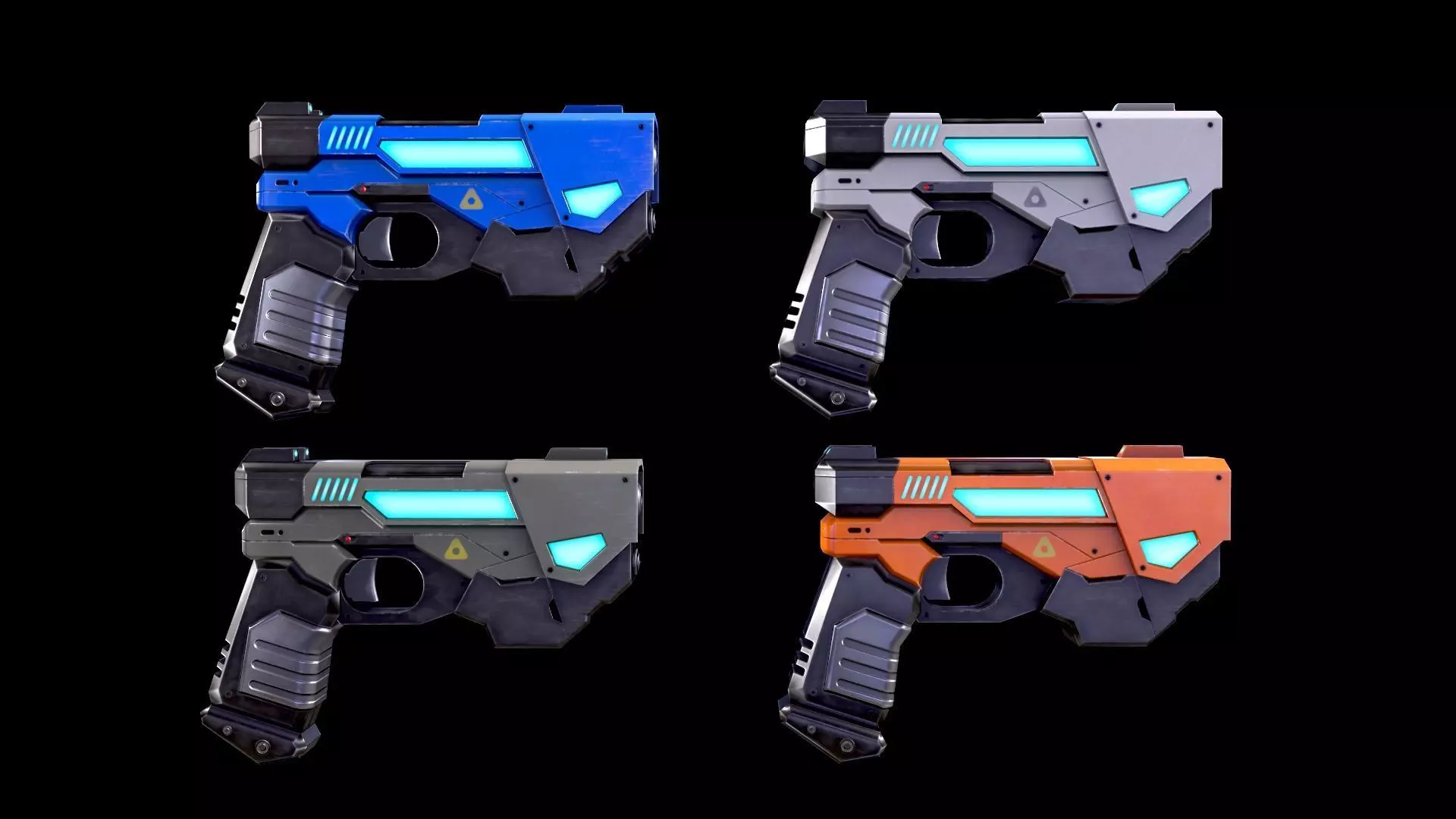 This is a pack of 4 futuristic handguns with different color schemes. The model includes 4K textures, low poly count, UV optimization, and clean topology.