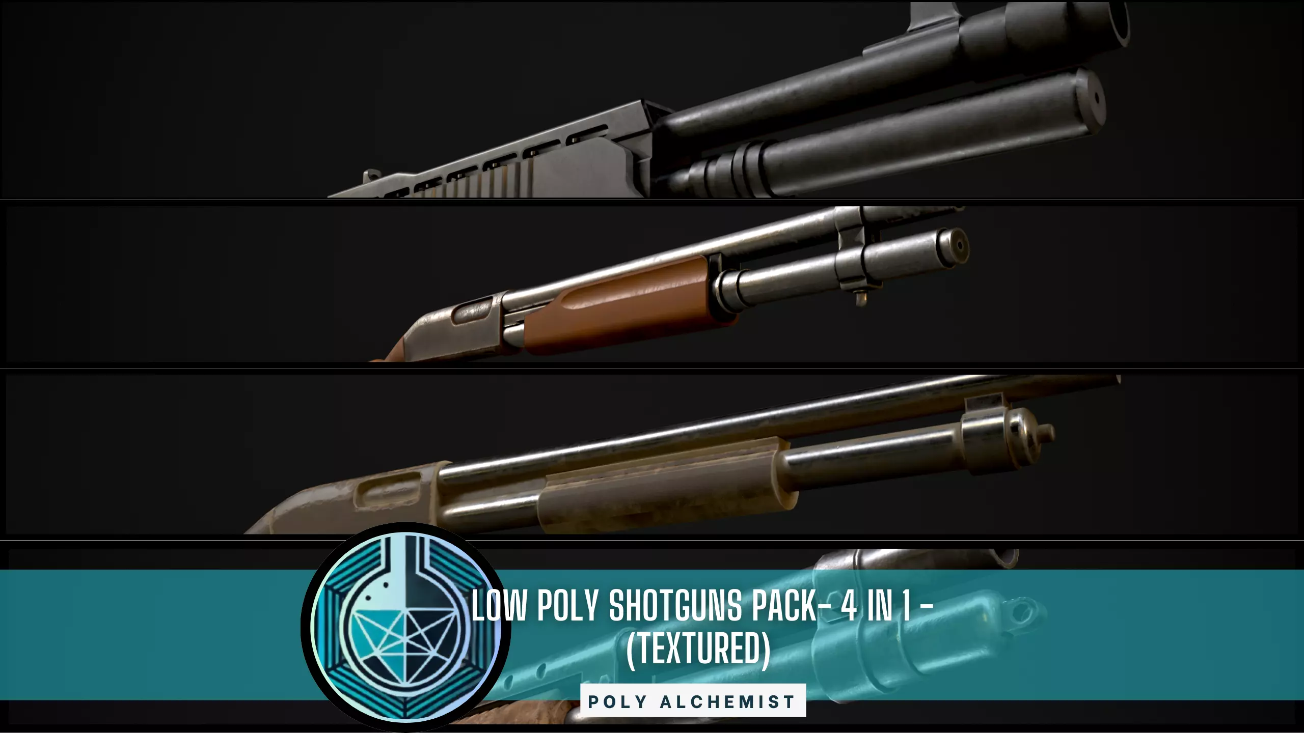 Pack containing 4 low poly shotguns that are perfectly suitable for lowpoly mobile games.