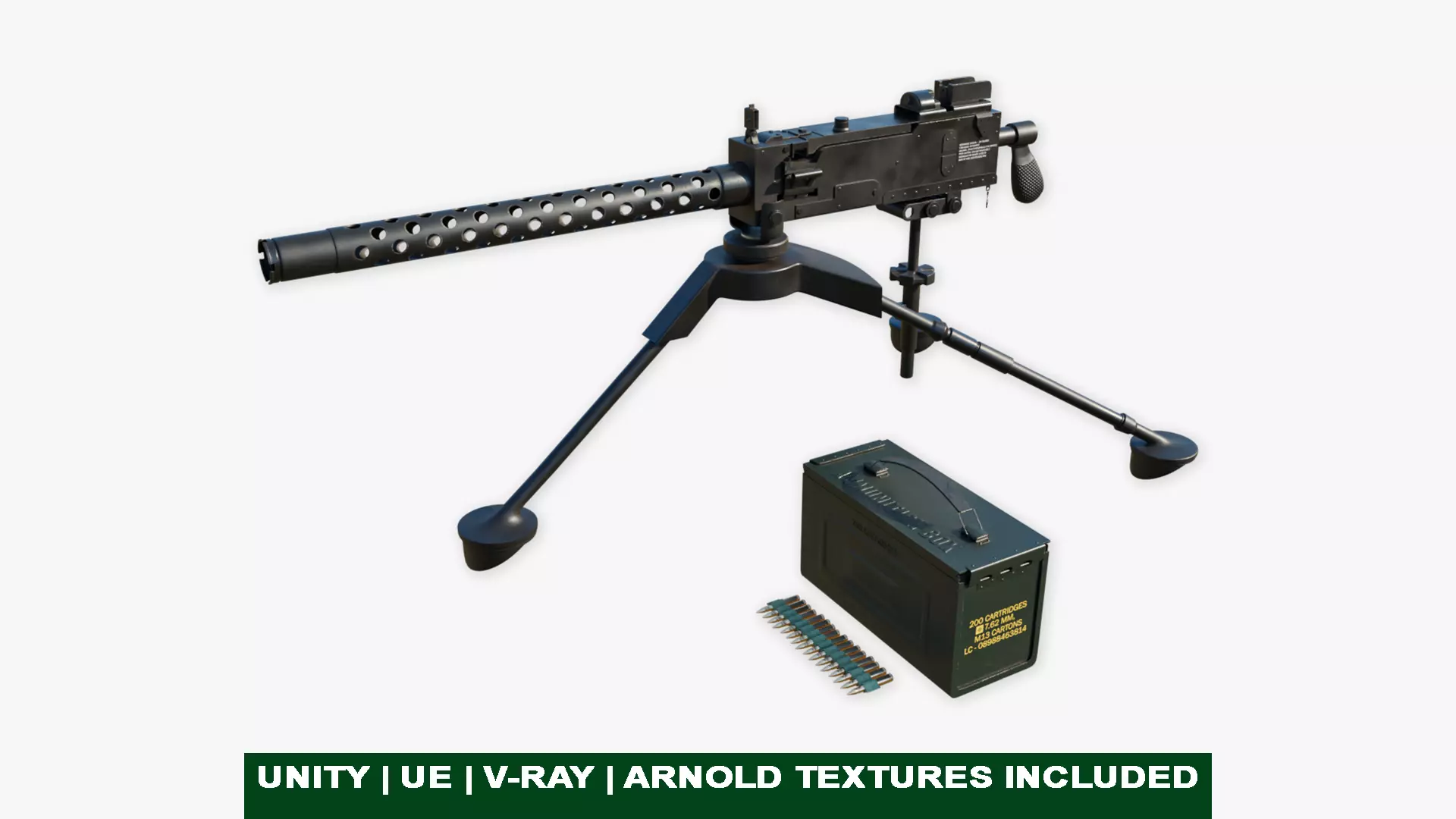 Photorealistic 3D model of M1919 Browning Gun03 and Stand, This Collection model is suitable for any visual production - broadcast, high-res film close-ups, advertising, games, design visualization, forensic presentation, etc.
