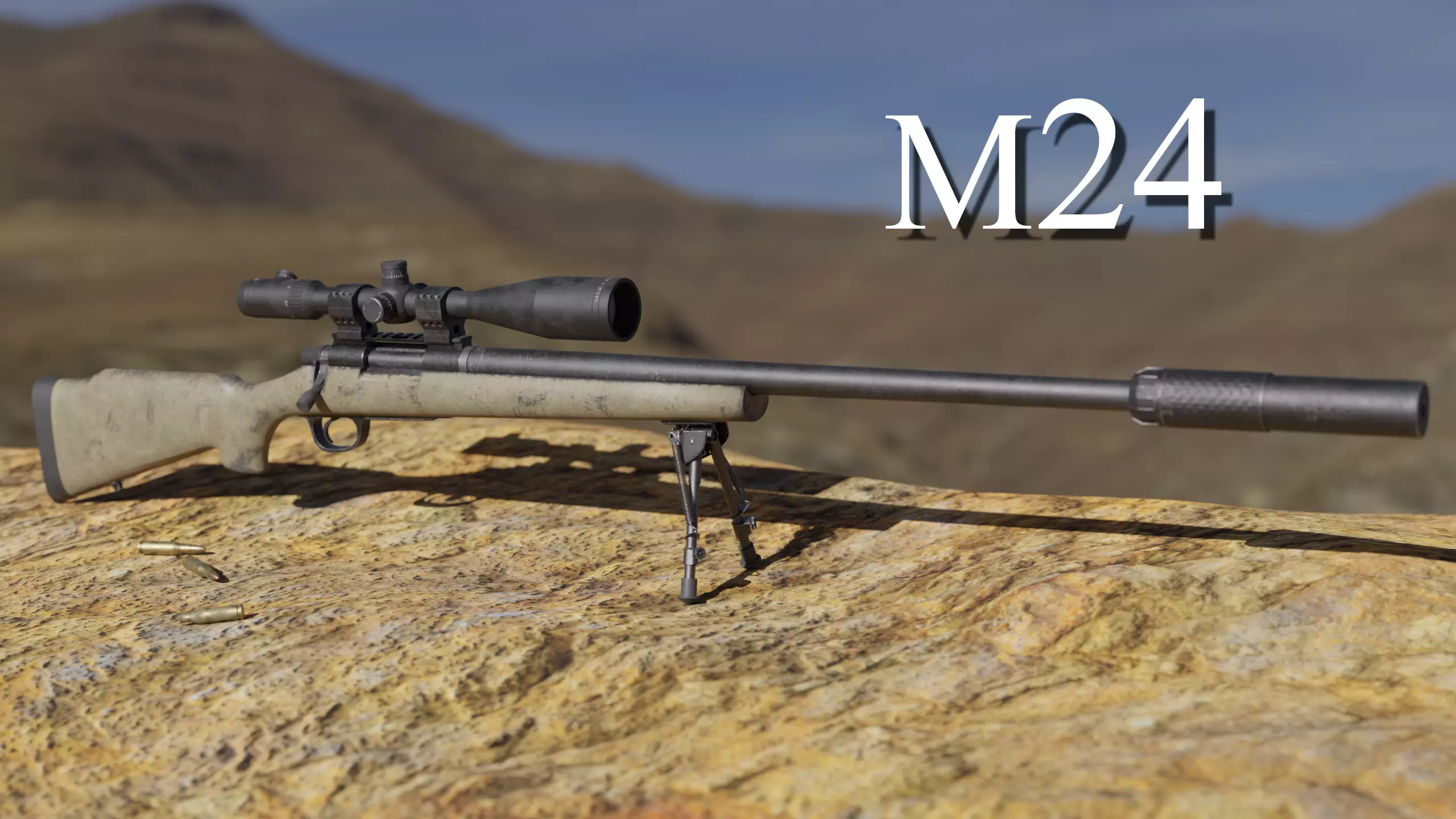 Low poly 3D model of a M24 sniper rifle with PBR materials. Model has 25 645 quads and includes 4k Diffuse, Metallic, Roughness and Normal maps. All the moving parts are separated into vertex groups for easy rigging/animating. Rendered in Blender (Cycles).
