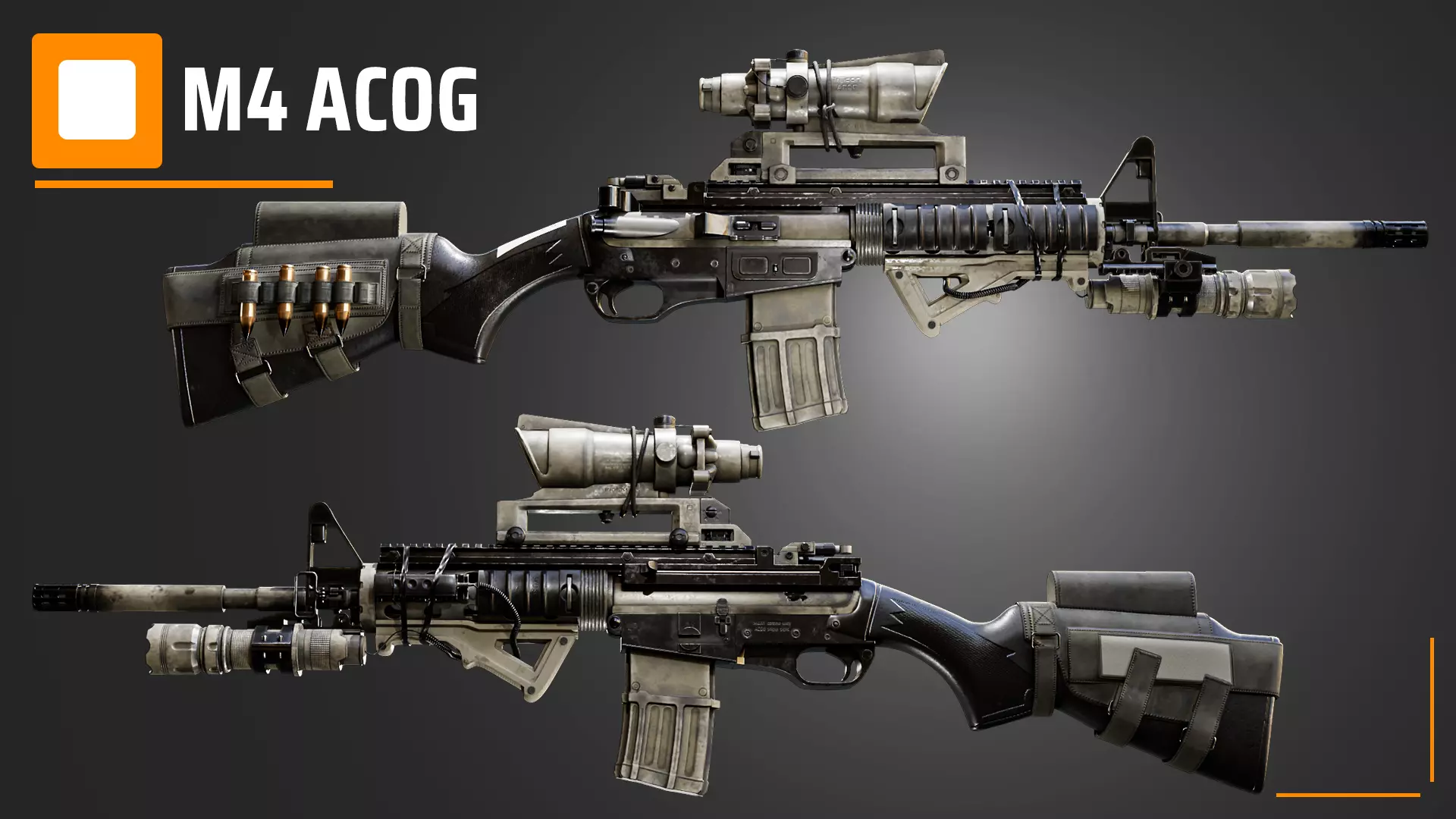 This 3D Model, Called M4 Classic with ACOG Scope, And I did it in 3dsmax and has 18 divided parts to improve the quality of material processing.In terms of material, The model is made of three types of materials: plastic-glass and metal