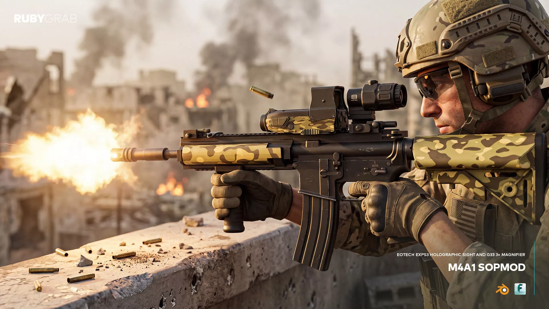 This is a detailed 3D visualization of the M4A1 SOPMOD carbine equipped with an EOTech EXPS3 holographic sight and G33 3× magnifier.
