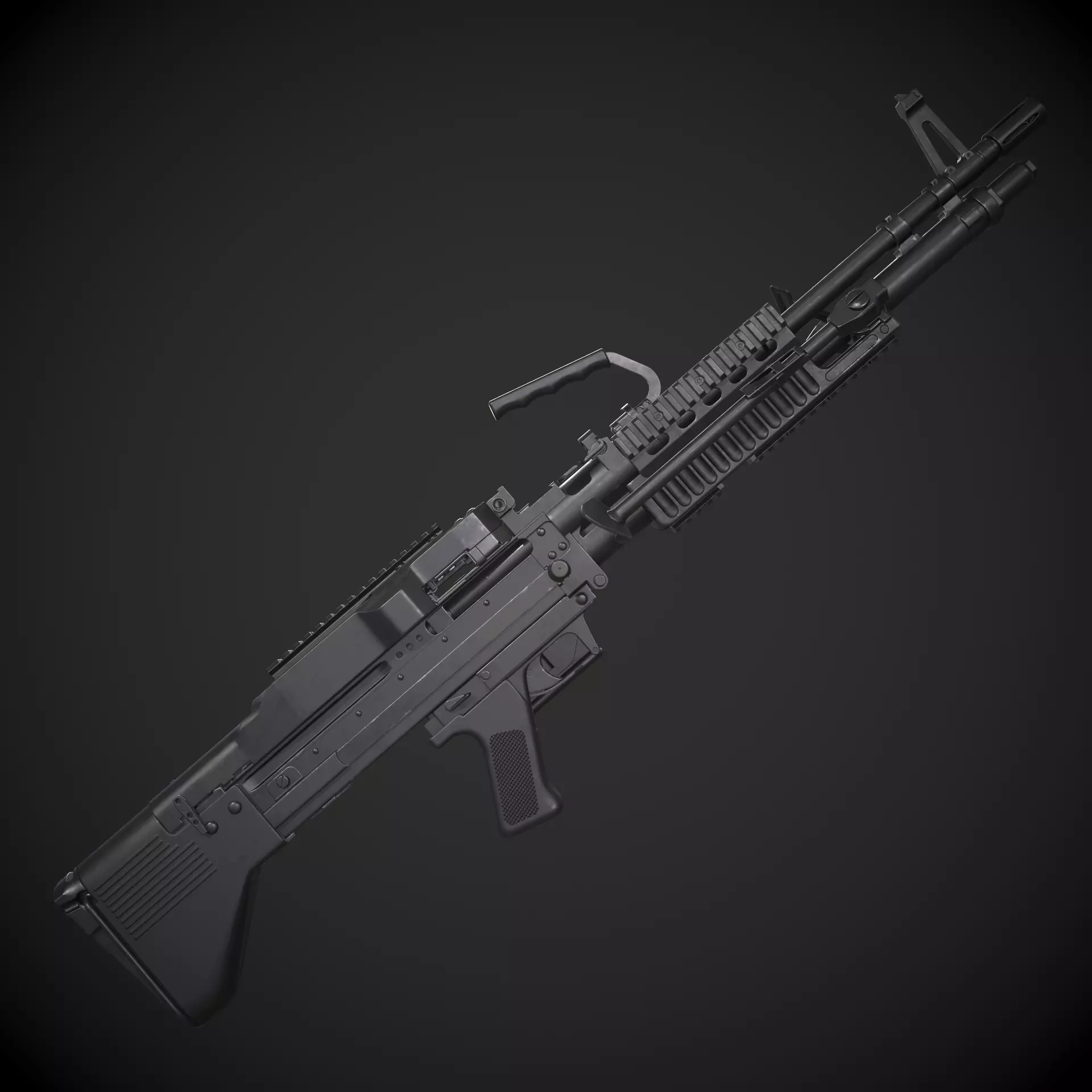 Game-ready M60 E4 Variant asset, with PBR textures included in the files. This has 14155 polys (24648 tris) and 13551 vertices.Parts such as the trigger and charging bolt have been segregated for animation/rigging purposes. The asset also has two (2) sets of rails that can be swapped.