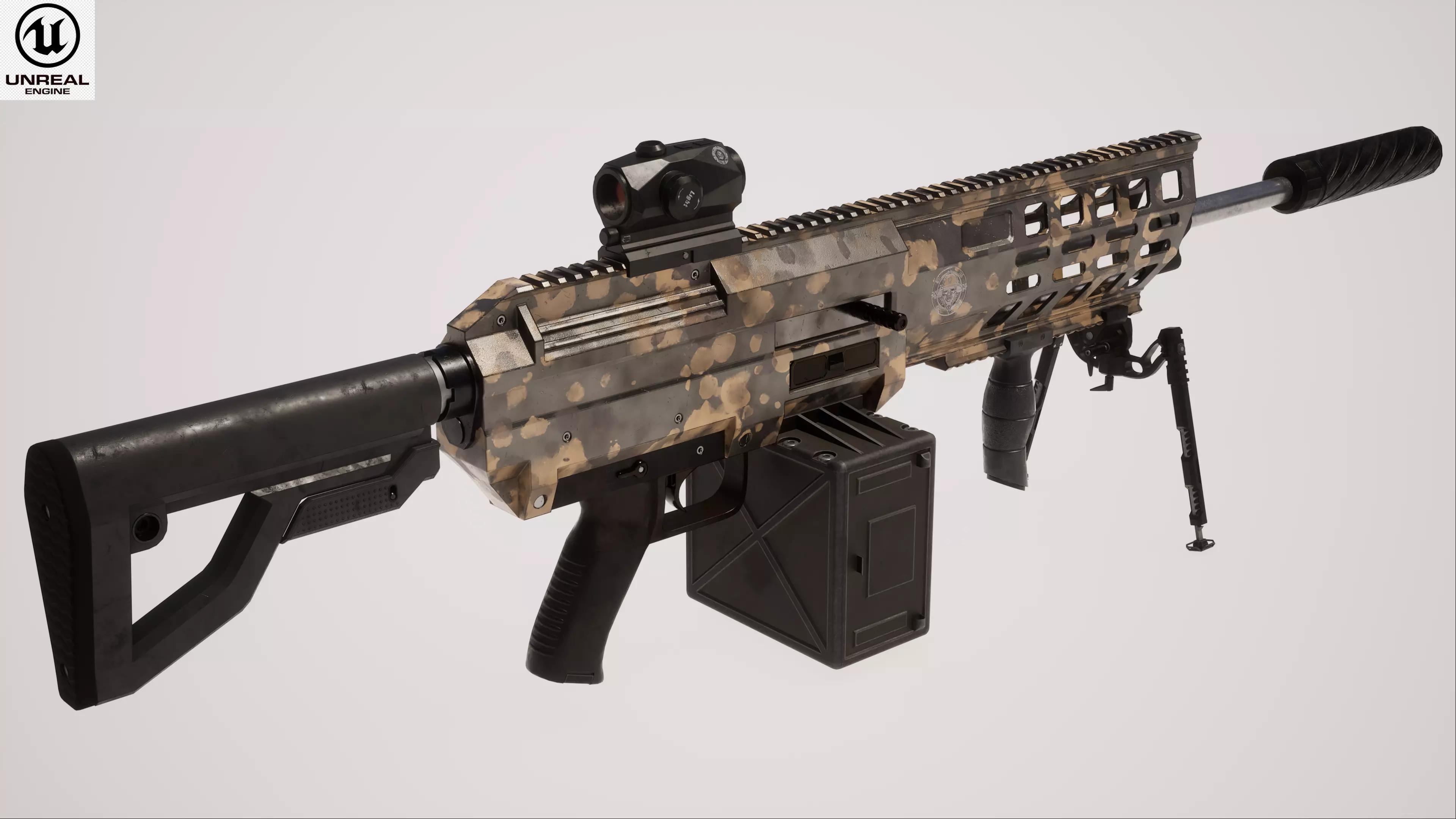 This Machine Gun 1 Used is a high quality, photo real model that will enhance detail and realism to any of your rendering projects. File units - cm. The model has a fully textured, detailed design that allows for close-up renders, and was originally modeled in 3ds Max 2021 and rendered with Unreal Engine 5 and V-Ray.