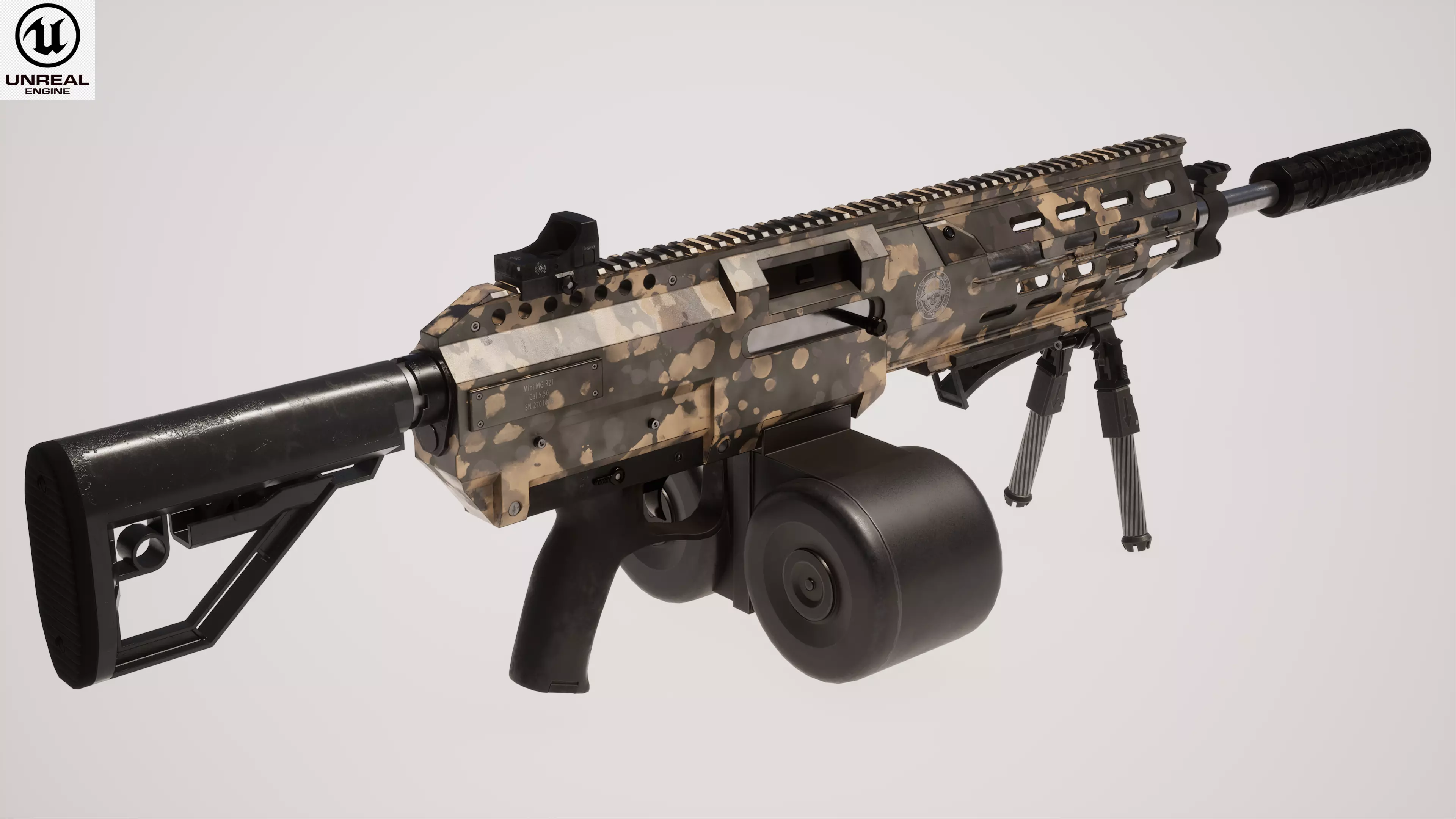 This Machine Gun 2 Used is a high quality, photo real model that will enhance detail and realism to any of your rendering projects. File units - cm. The model has a fully textured, detailed design that allows for close-up renders, and was originally modeled in 3ds Max 2021 and rendered with Unreal Engine 5 and V-Ray.