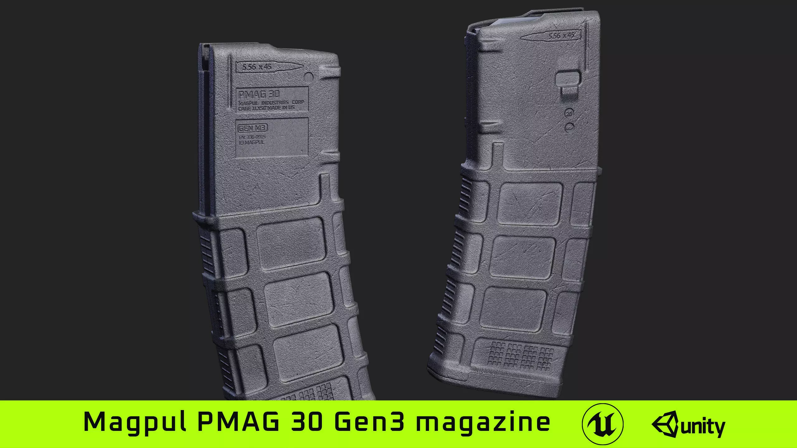 Lowpoly and realistic Magpul Pmag Gen3 30 round magazine 3d model optimized for game engines or any other usage in 3d software.