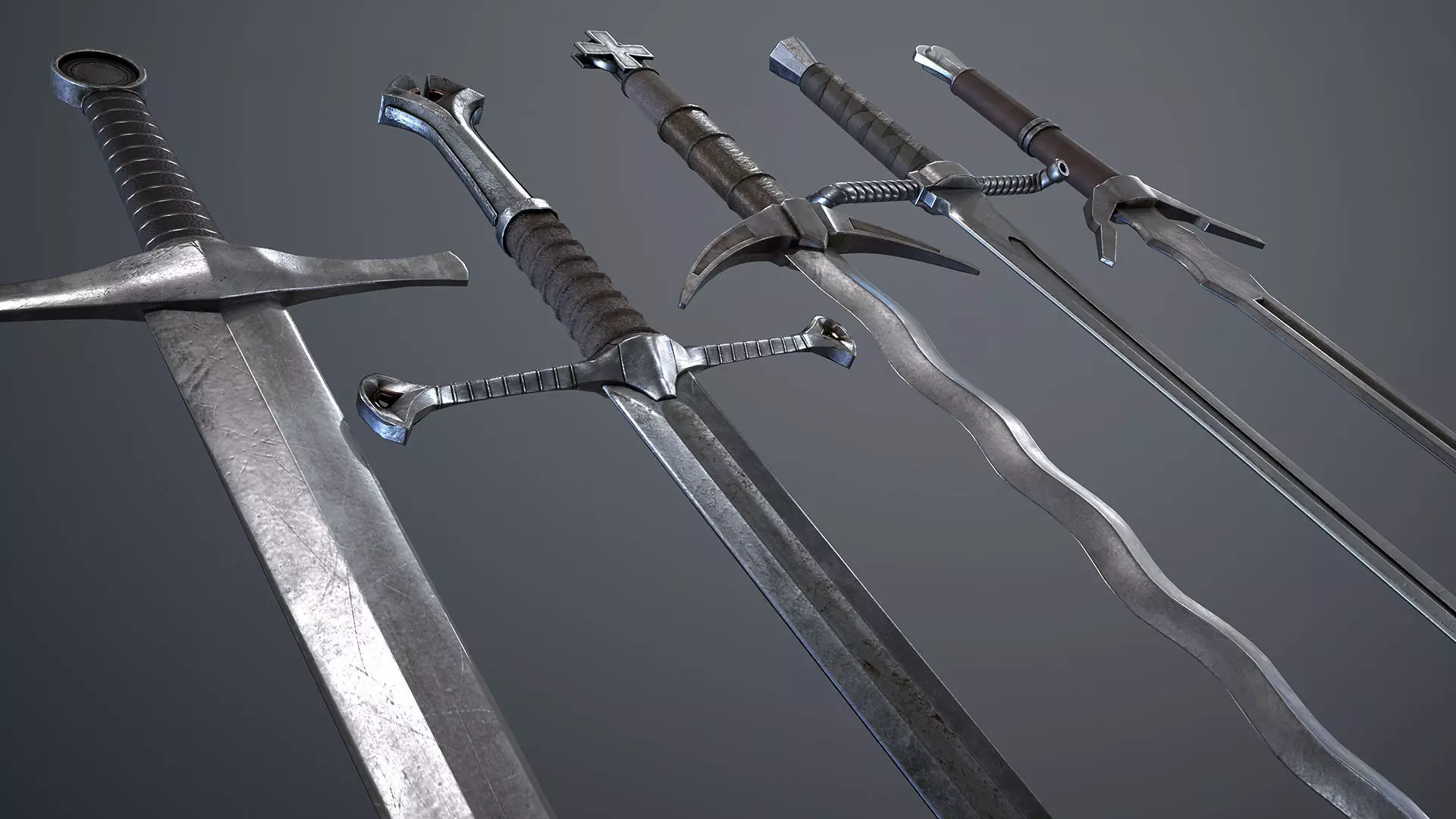 Number of Unique Meshes: 40Vertex Count: 20 lower part, 695-1000 full sword;Number of Textures: 240 х blades; 120 x guards; 120 x handles;Texture Resolutions: 1024-2048;