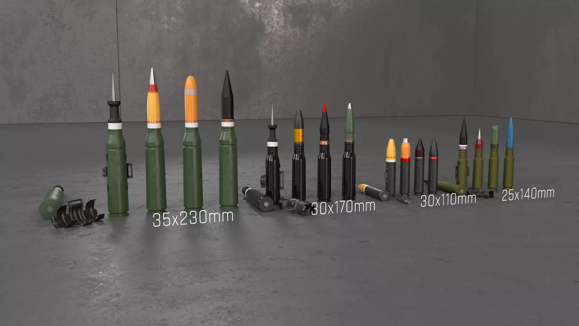 Fictional medium caliber ammunition. Three different calibers. 35mm, 30mm, 30mm short, and 25mm. Each caliber also comes with a link. All models except links are non sub-d models.