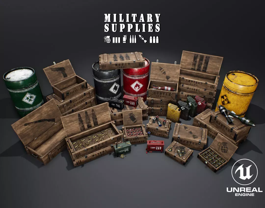 This package contains 21 Military Supplies Props, incluiding: Bullets, Crates, Grenades and more. With customizable Materials, Blueprints and multi texture resolutions from 512x512 to 4096x4096.
