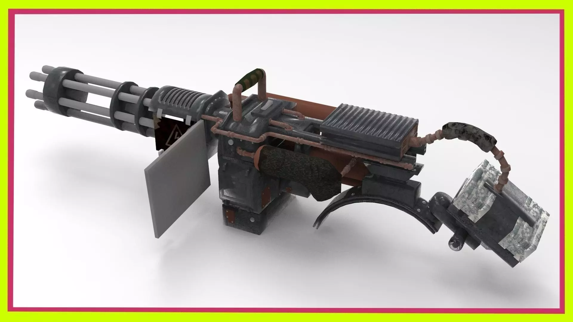 The basic minigun is a six-barrel, air-cooled, and electrically driven rotary machine gun. The electric drive rotates the weapon within its housing, with a rotating firing pin assembly and rotary chamber The minigun's multi-barrel design does not prevent overheating, but also serves other functions. Multiple barrels allow for a greater capacity for a high firing rate, since the serial process of firing / extraction / loading is taking place in all barrels simultaneously. Thus, as one barrel fires, two others are in different stages of shell extraction and another three are being loaded. The minigun is composed of multiple closed-bolt rifle barrels arranged in a circular housing. The barrels are rotated by an external power source, usually electric, pneumatic, or hydraulic. Pressure, pressure, energy