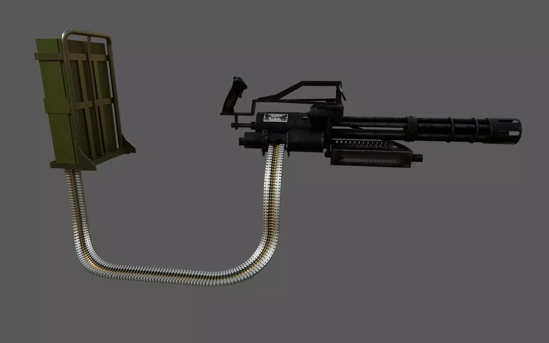 This is a 3d model of a m134 Gatling gun. It is a 6 barreled weapon system capable of firing 6000 7.62 mm rounds per minute.MINIGUN M134 with ammunition backpack and hand grip.