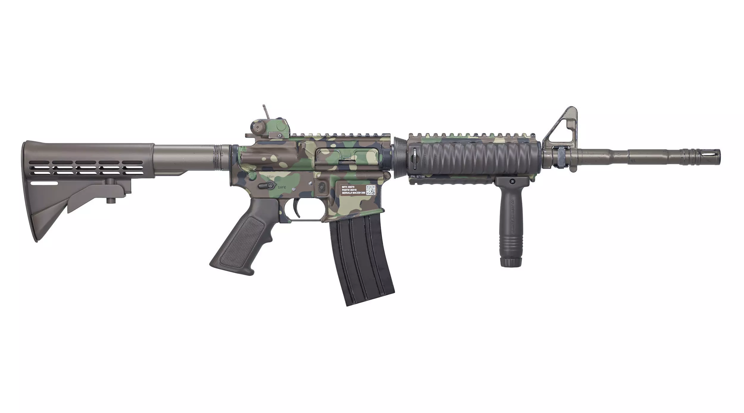 High-quality realistic Modern Tactical 5.56 Assault Rifle_Military 3D model featuring classic woodland camouflage finish and tactical attachments.The model includes detailed upper and lower receivers, quad rail handguard, vertical foregrip, detachable carry handle/rear sight, adjustable stock,standard STANAG magazine, and A2 front sight.