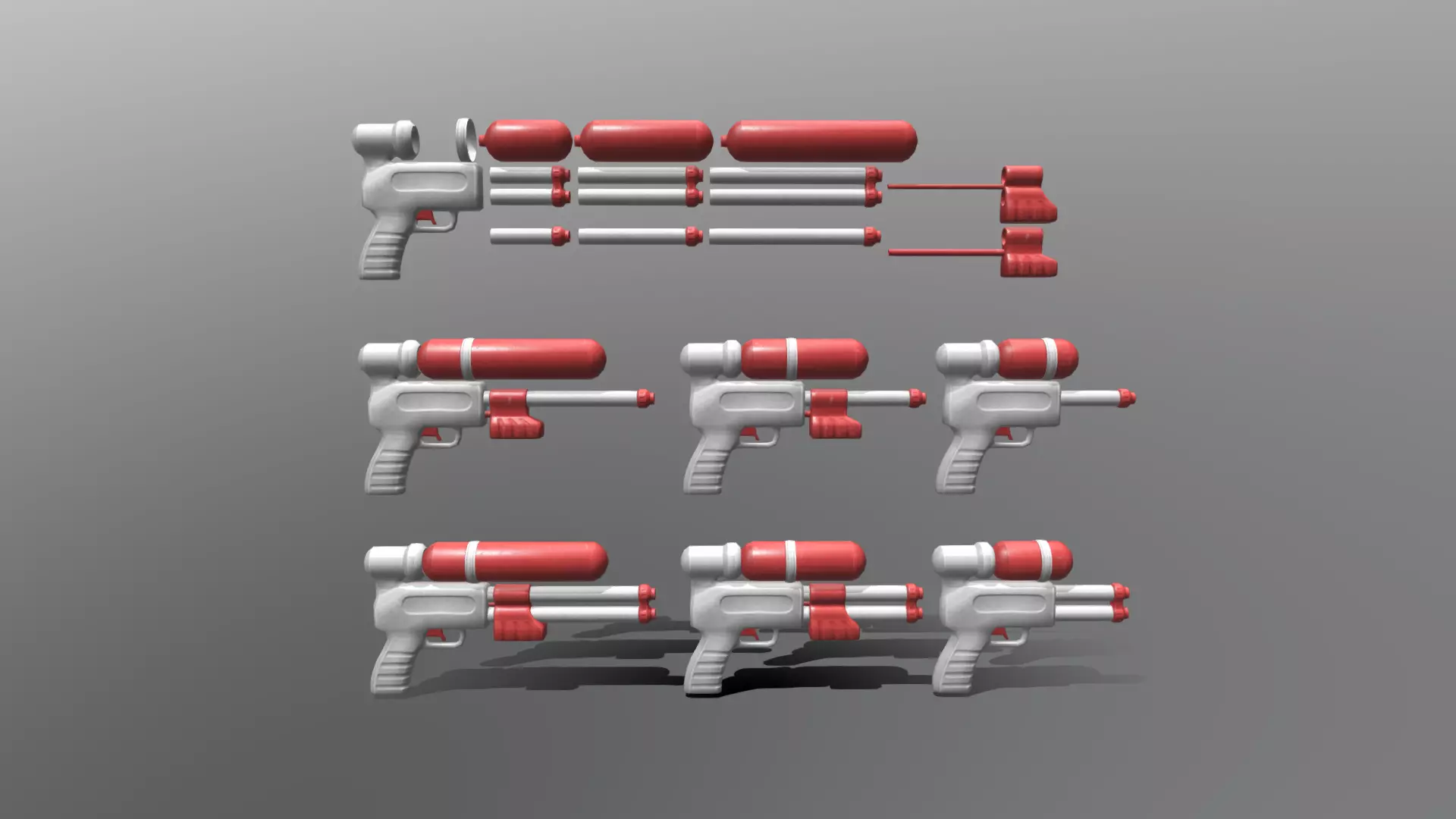 Contains 13 parts,6 premade pistols joined, 4 different colour combinations (White Red, Blue Yellow, Orange Blue, Pink Green) 4096*4096 PBR textures (albedo, specular, normal). Poly count for complete pistols range from 2092-2844.