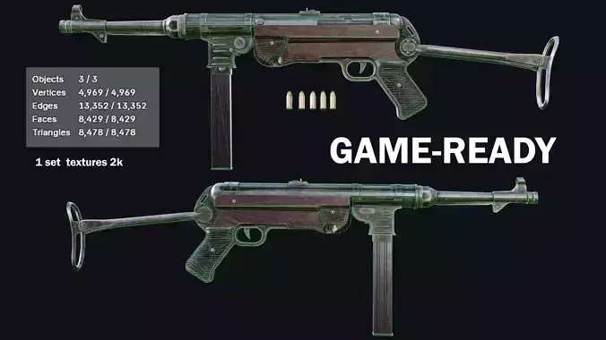 MP- 40 machine gun WWII High-quality, game-ready 3D model inspired by a WWII-era submachine gun. Created with attention to historical silhouette and proportions, suitable for film, game, and educational visualization. Includes clean topology, optimized UVs, and multiple texture sets to support realistic metal and wood finishes.