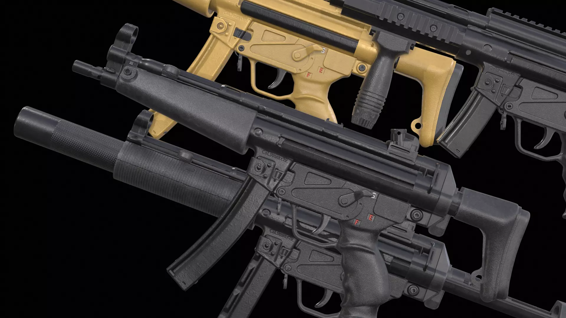 Game ready low (mid)-poly 3D models of MP5A3 and MP5SD3 + upgrades (FBX, Maya, Blender, 3ds Max). (Check out my other MP5 family models!)