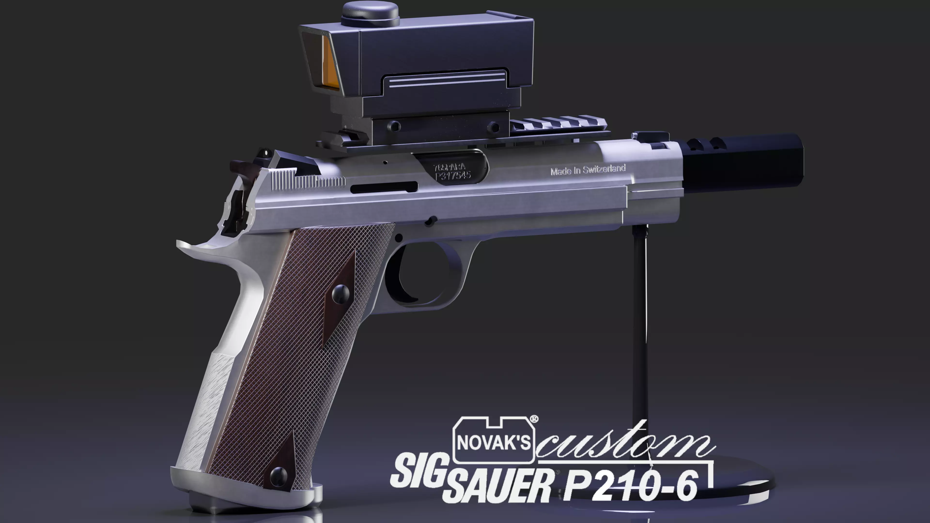 This particular model is based on the 7.65 Parabellum variants of the p210. It comes with two “race gun” inspired attachment sets. The first set contains a sight mount, an ADCO “square shooter” optic, and a fictional compensator. The second set includes a sight mount, Aimpoint 1000 + pic adapter, the P210-6 Heavy Frame Longslide Compensator, and finally, the NCstar red dot laser + universal pistol trigger mount.
