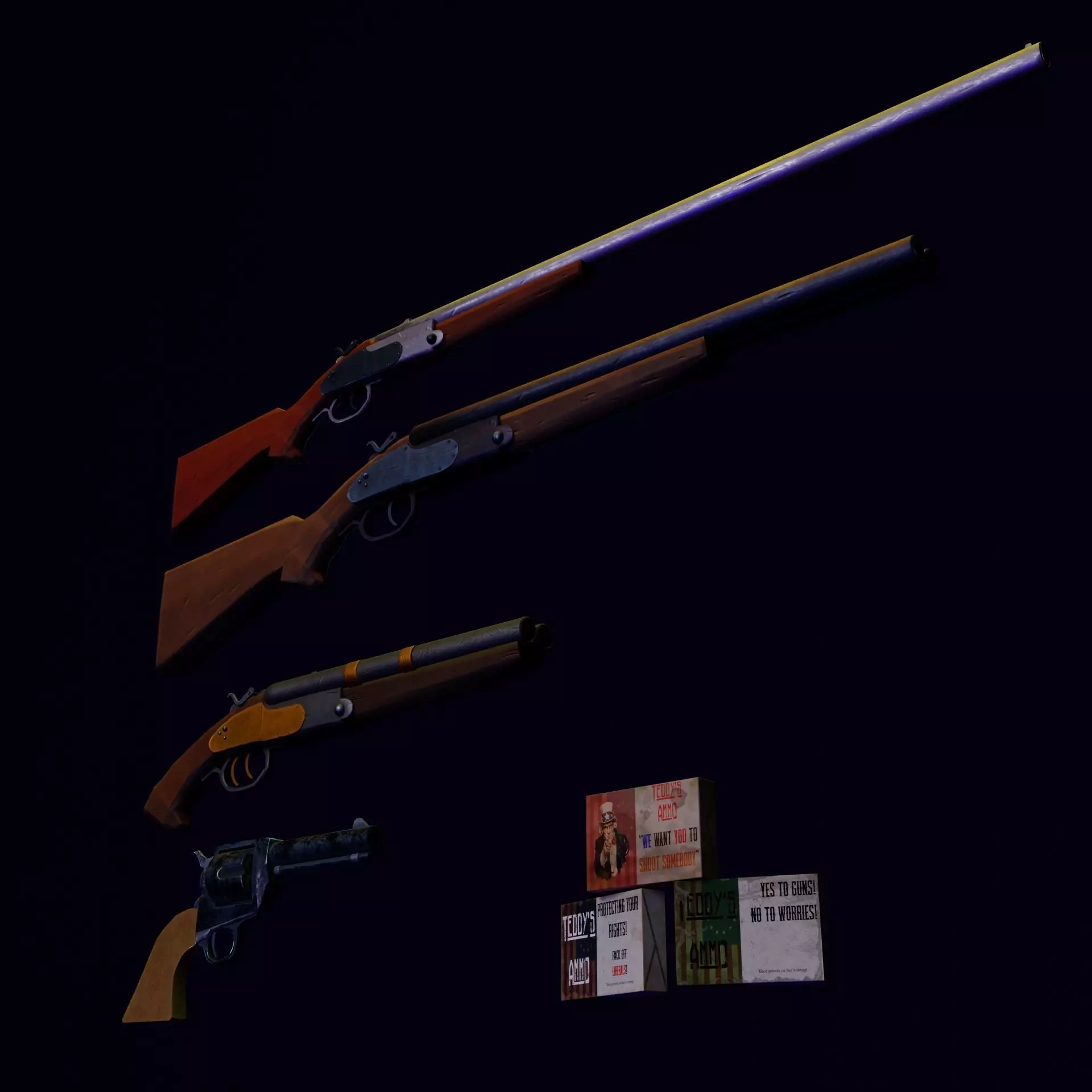 Pack content: -1 Revolver. -1 Shotgun. -1 Sawed off Shotgun. -1 Rifle. -1 Ammo box for any weapon in the pack. The package uses a fictional brand, with ironic advertisements (GTA style). - Also, you'll got the 3D and texturing archives, as well the FBX game ready archives, to easily opening in your game engine.