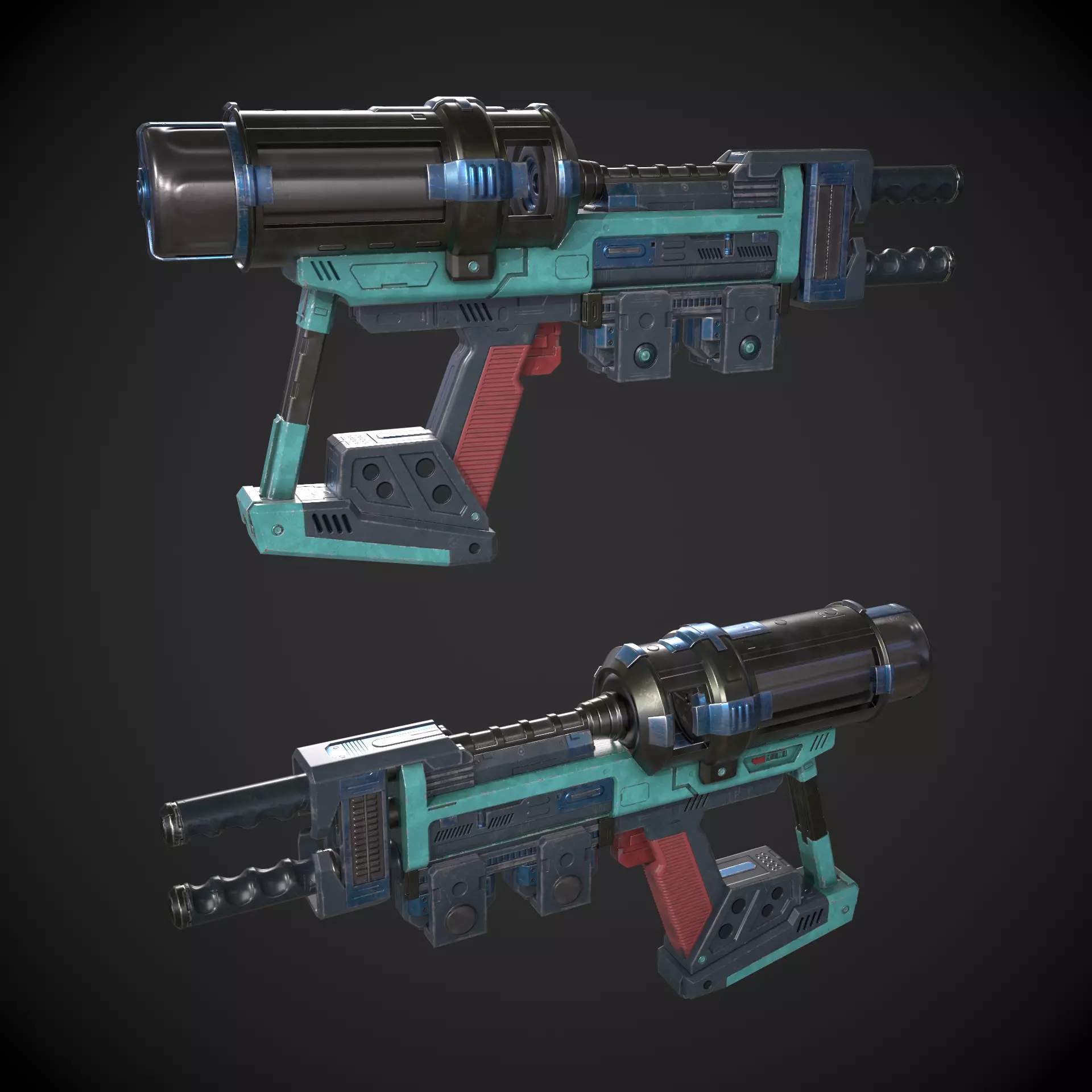 Game-ready Photon Phaser Gun asset, with PBR textures included in the files. This has 7671 polys (14373 tris) and 7849 vertices.