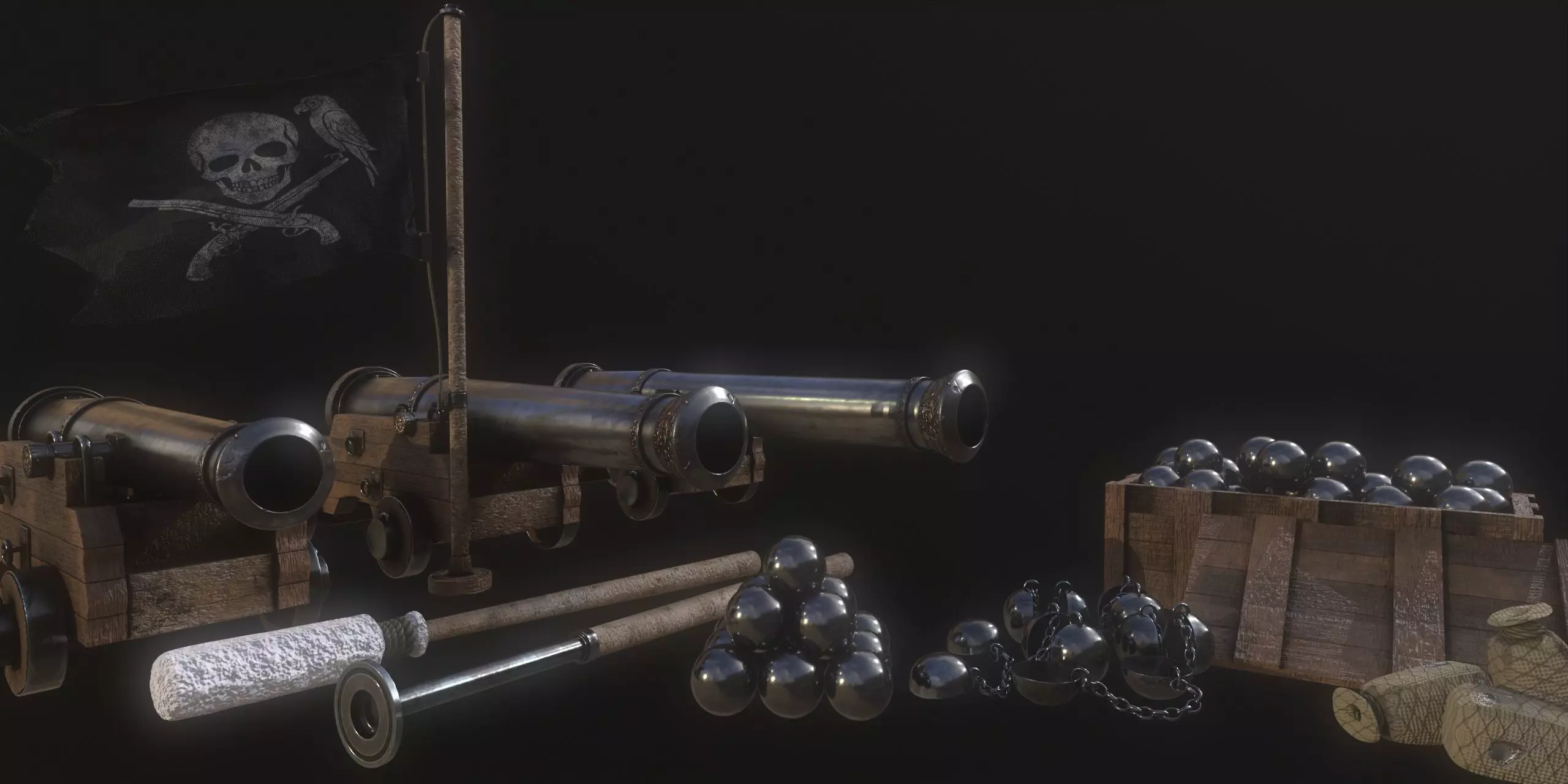 Elevate your pirate scene with this high-quality, game-ready naval artillery pack. This meticulously modeled set includes everything you need to recreate a powerful broadside from the age of sail.