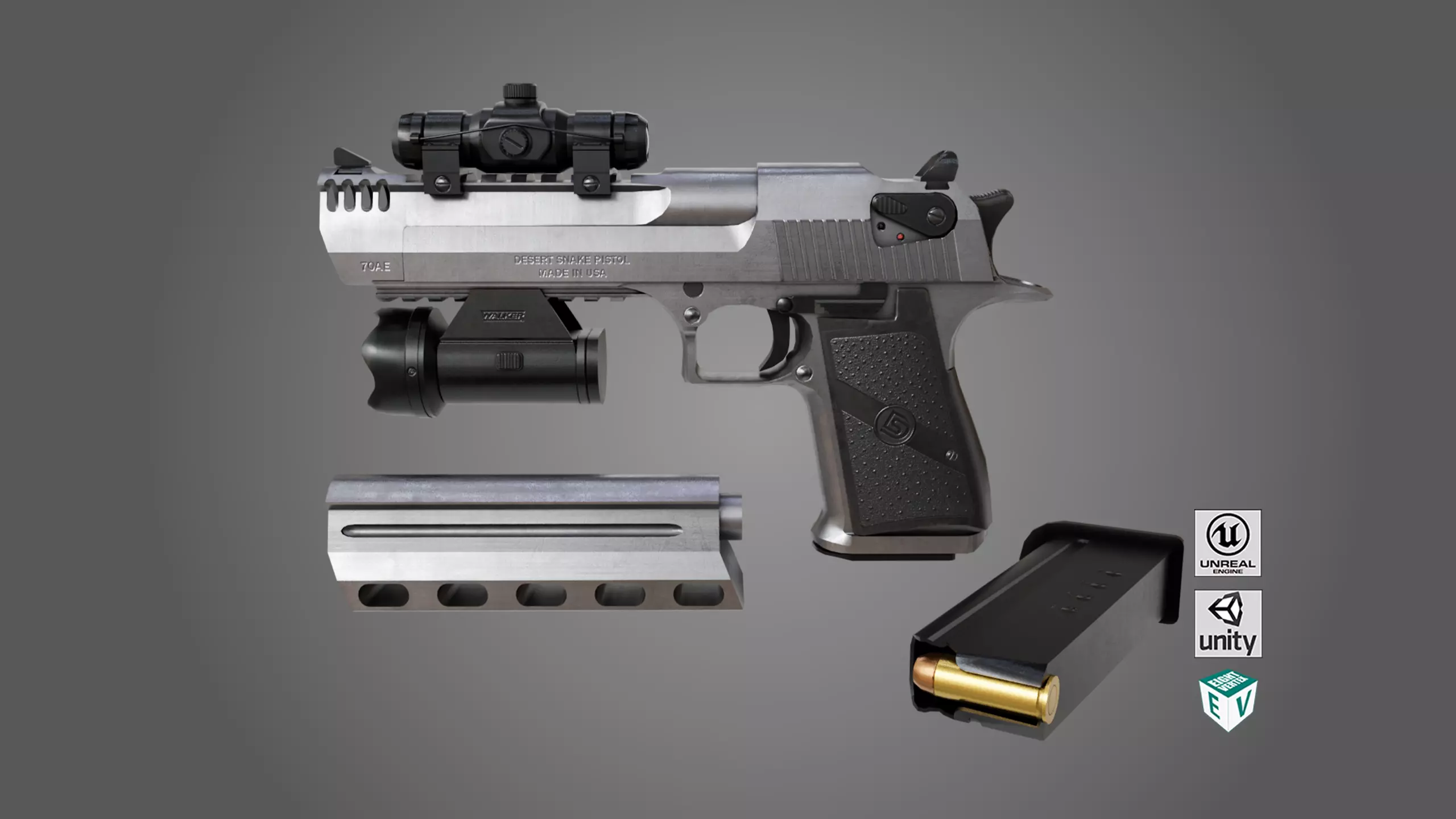 The Photorealistic 3D Model of Pistol 10 Silver Generic Gun 3D Model of Desert Egale. This model is suitable for any visual production - broadcast, high-res film close-ups, advertising, games, design visualization, forensic presentation, etc.