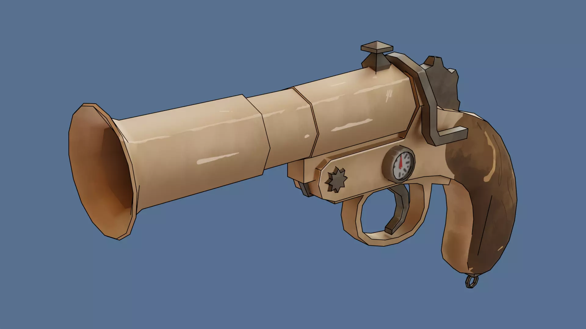 This 3D model is a simple pistol in a steampunk style with a cartoonish texture. It features typical steampunk attributes such as metallic details with rivets, gears, and a pressure gauge that suggests the use of steam or pressure as a power source. The grip of the pistol mimics the texture of polished wood and, despite its stylized shape, looks comfortable to hold. Overall, the pistol combines elements of Victorian industrial design with exaggerated, over-the-top forms that are characteristic of an cartoon style.